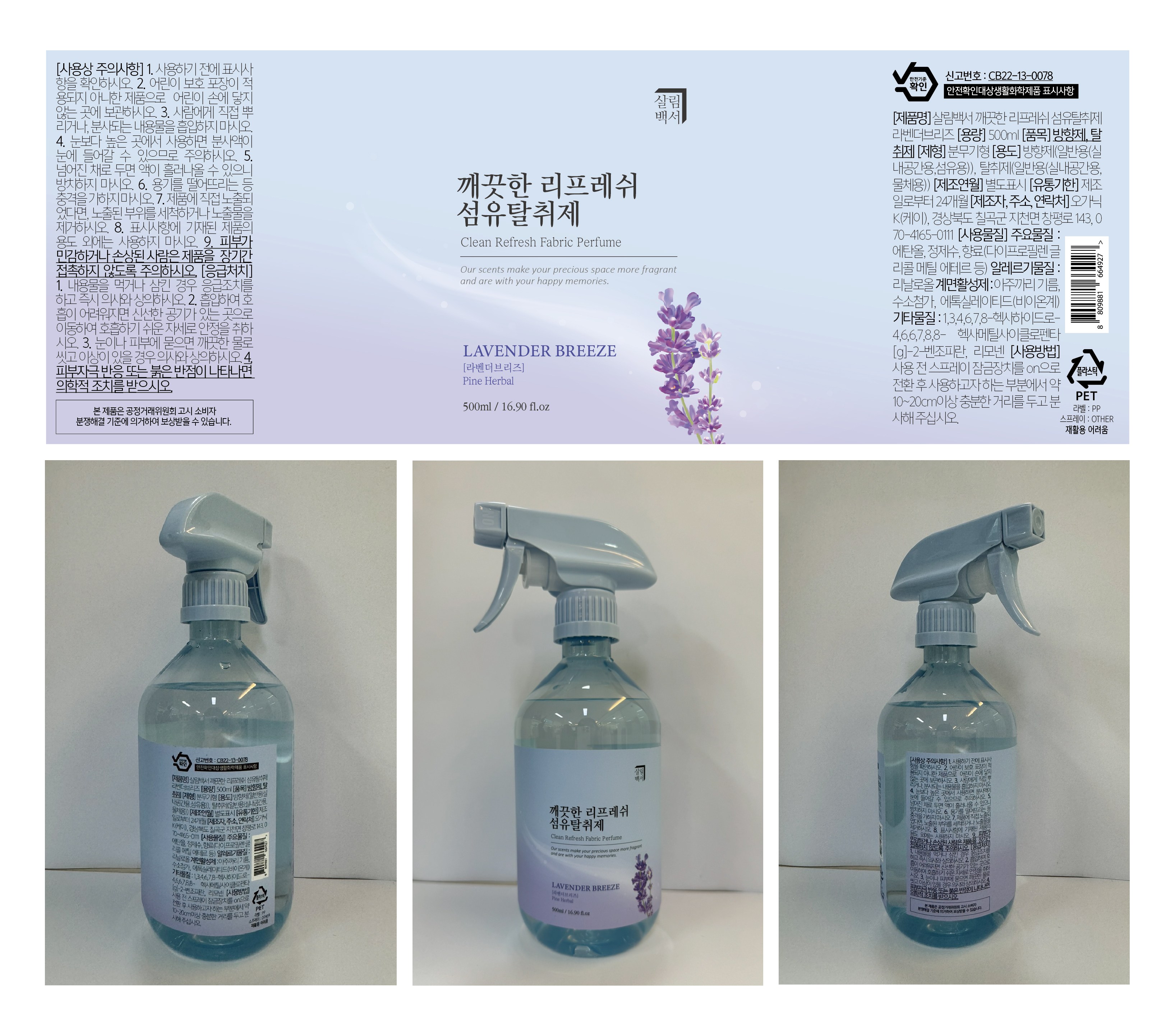 | 품목 및 제품명 | 방향제,탈취제 / 살림백서 깨끗한 리프레쉬 섬유탈취제 라벤더브리즈 | 용도(표백제의 경우 계열을 함께표시) 및 제형 | 방향제(일반용(실내공간용,섬유용)), 탈취제(일반용(실내공간용,물체용))/분사형-분무기형 |