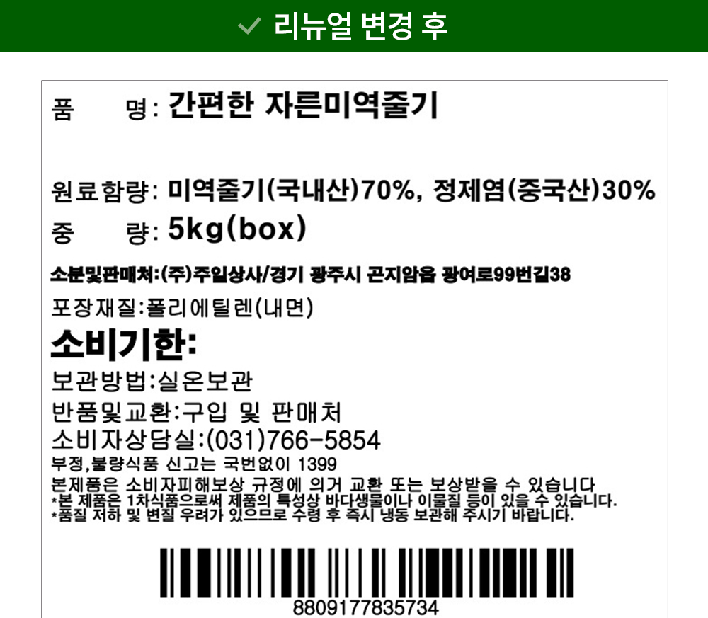 | 제조연월일, 소비기한 또는 품질유지기한 | 업데이트 예정 | 세부 품목군별 표시사항 | 농수산물 : 유전자변형(해당 없음) / 지리적 표시사항(해당 없음) |