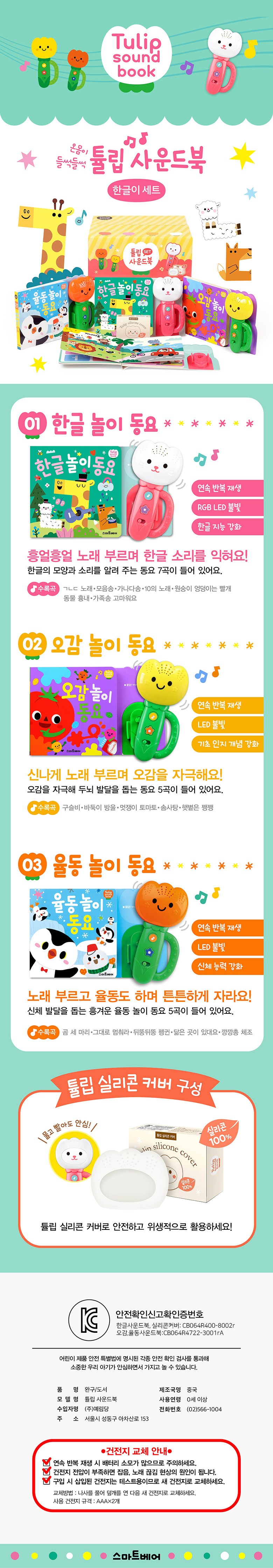 | 품명 및 모델명 | 튤립 사운드북 한글이 세트 전 3권 + 실리콘커버 세트 | KC 인증정보 | 한글사운드북, 실리콘커버: CB064R400-8002r, 오감,율동사운드북:CB064R4722-3001rA / 한글:R-R-WSK-SB-T001,오감,율동:R-R-WSK-SB-T002 /건전지: B053R120-2002 |