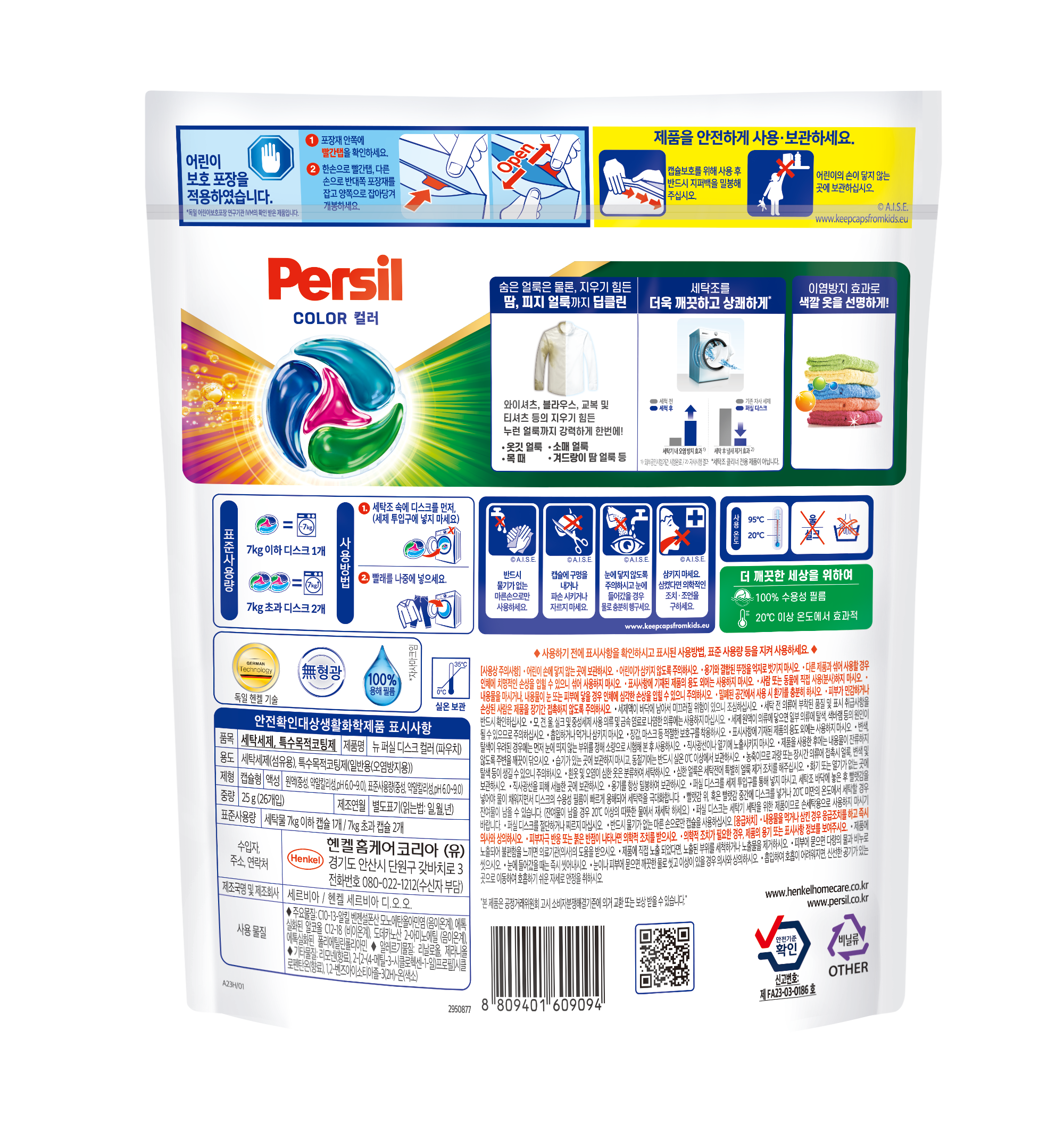 | 품목 및 제품명 | 세탁세제,특수목적코팅제 / 뉴 퍼실 디스크 컬러 (파우치) | 용도(표백제의 경우 계열을 함께표시) 및 제형 | 섬유용,일반용-오염 방지용 / 비분사형-캡슐형 |
