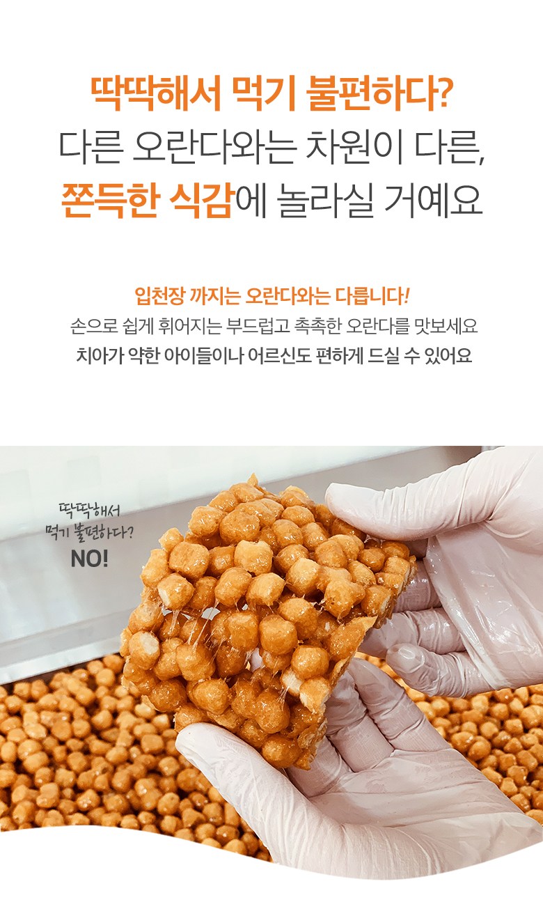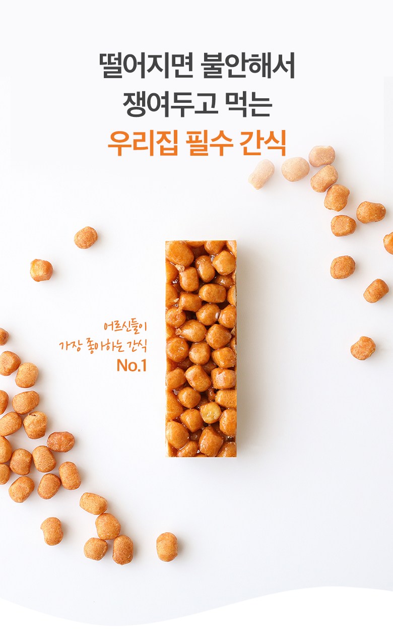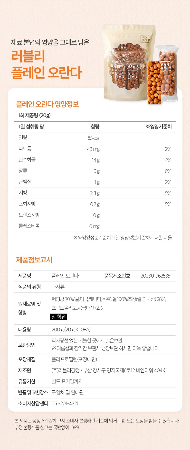 | 포장단위별 내용물의 용량(중량), 수량 | 200g (20g x 10개입) | 원재료명 및 함량 | 플레인 오란다[85kcal] - 퍼핑콩70%(밀:미국,캐나다,호주), 쌀100%조청(쌀:외국산), 프락토올리고당(국내산) ※알레르기유발물질 밀함유 |