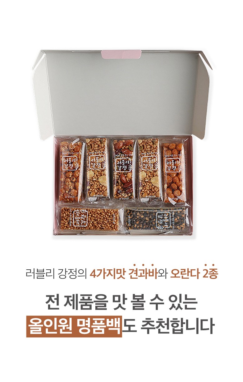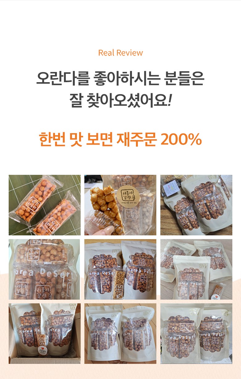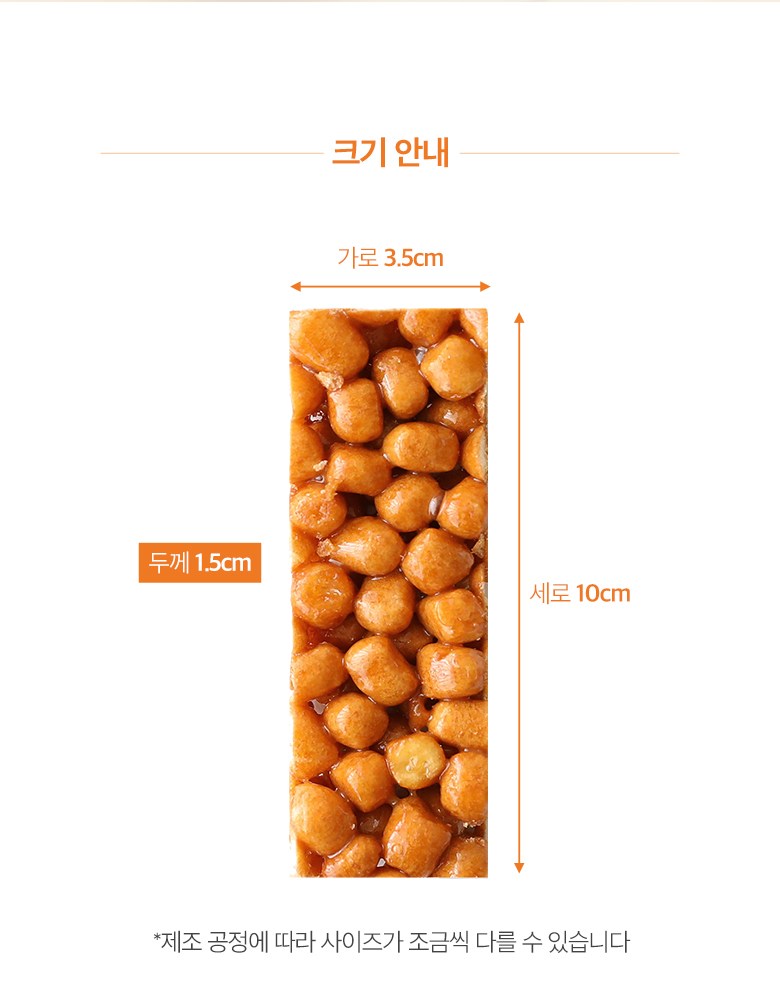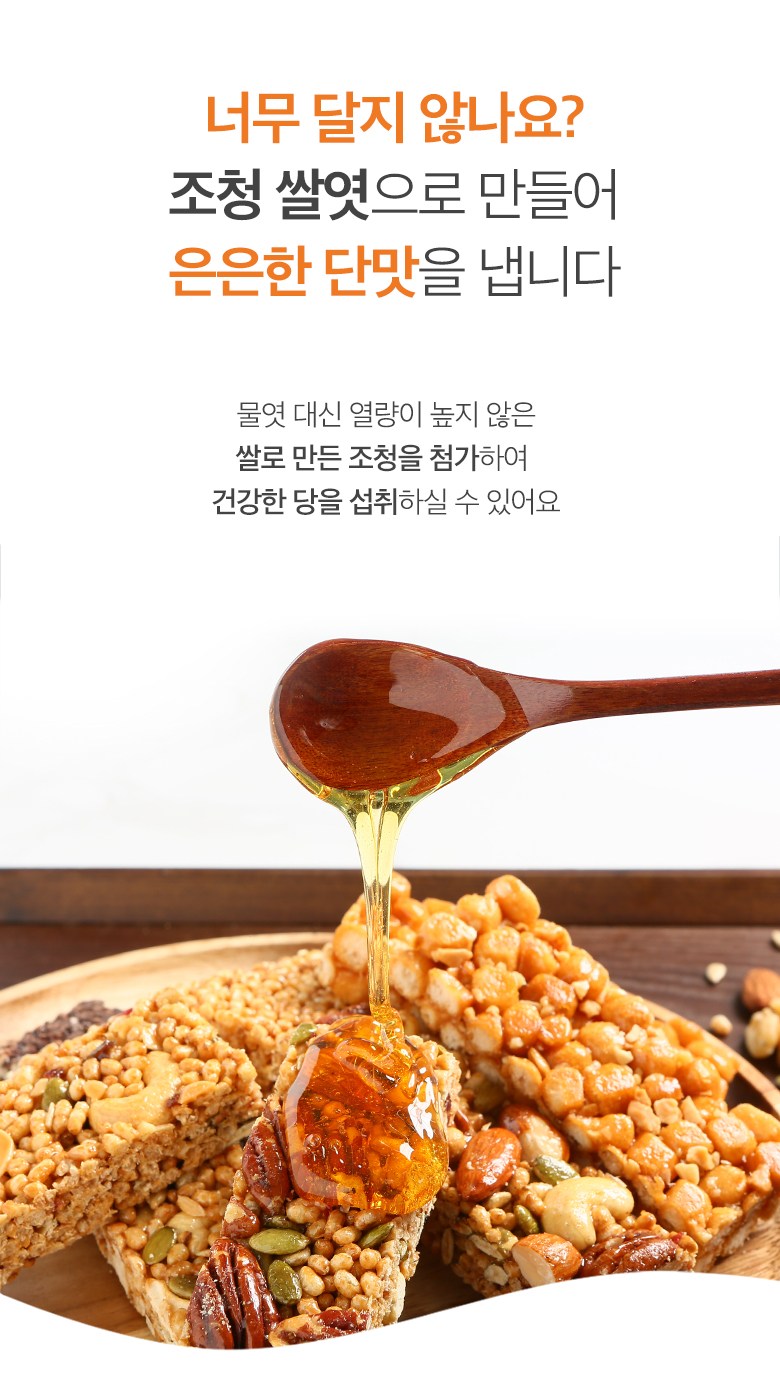 | 포장단위별 내용물의 용량(중량), 수량 | 200g (20g x 10개입) | 원재료명 및 함량 | 플레인 오란다[85kcal] - 퍼핑콩70%(밀:미국,캐나다,호주), 쌀100%조청(쌀:외국산), 프락토올리고당(국내산) ※알레르기유발물질 밀함유 |