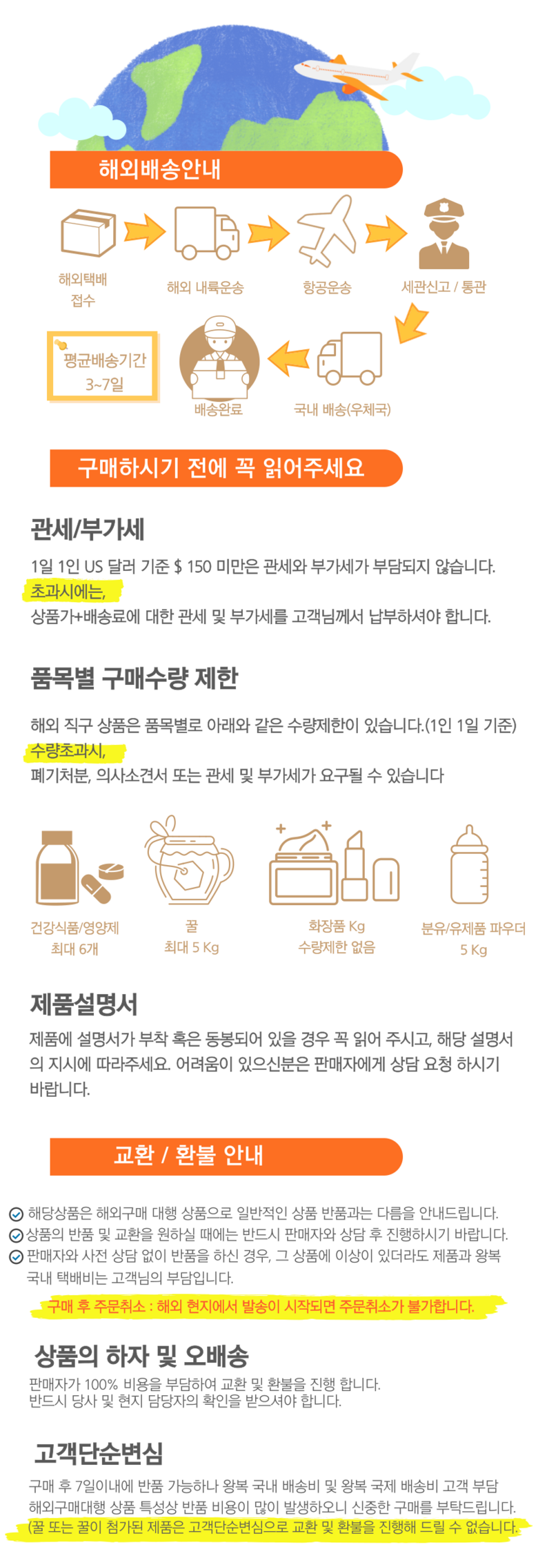 - 주문일 기준 동일 판매자 총 구매 금액이 면세 한도 초과 시 관부가세가 부과될 수 있습니다