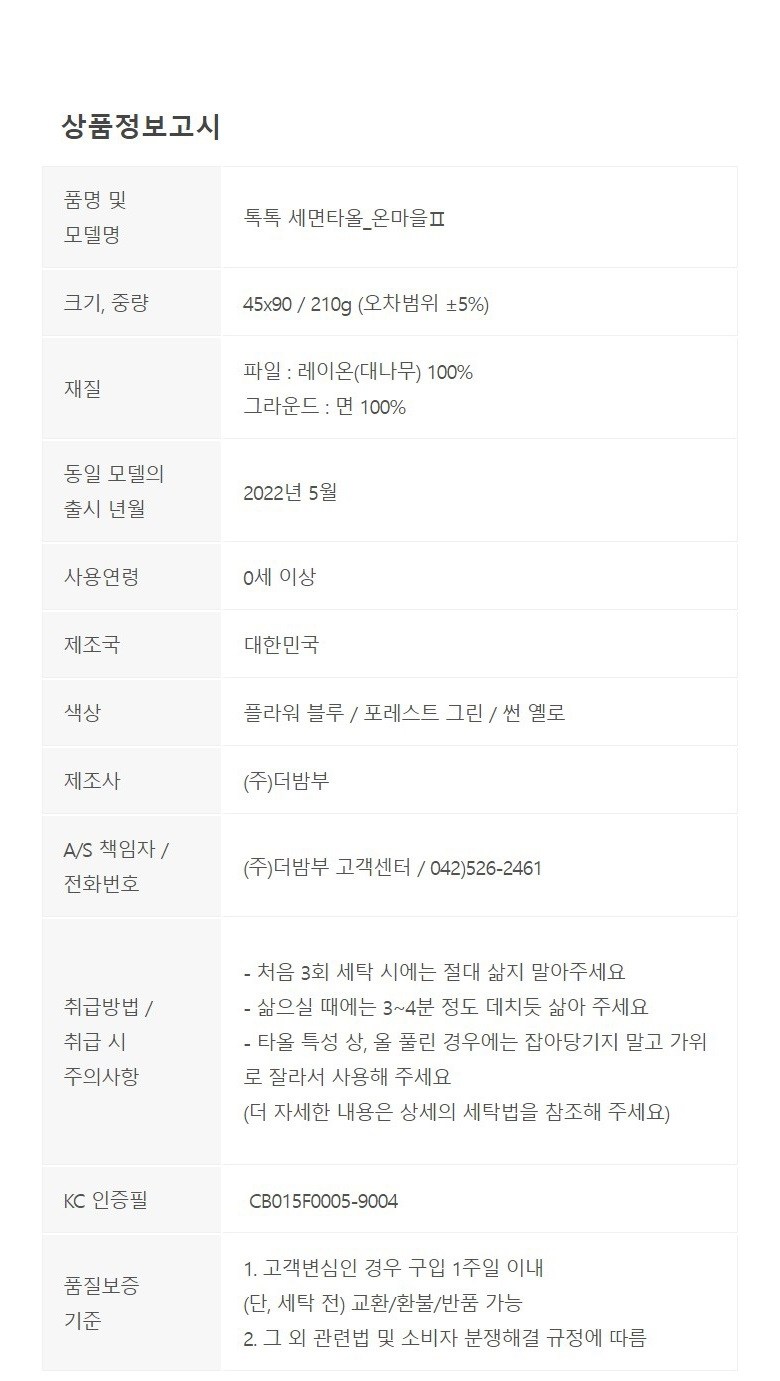 | 품명 및 모델명 | [밤부베베] 톡톡 세면타올_온마을II (포레스트그린) | KC 인증정보 | CB015F0005-9004 |