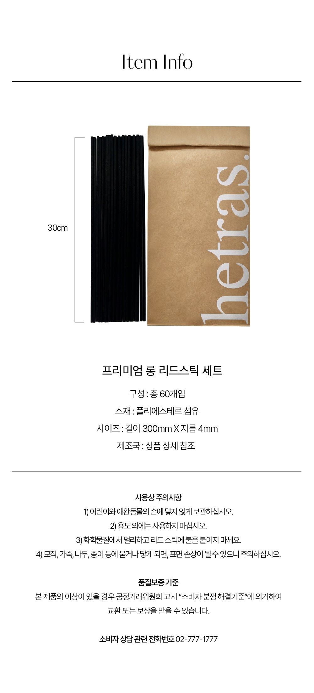 | 품명 및 모델명 | 헤트라스 프리미엄 디퓨저 고밀도 롱 섬유 리드스틱 30cm | 인증/허가 사항 | 해당없음(14세이상) |