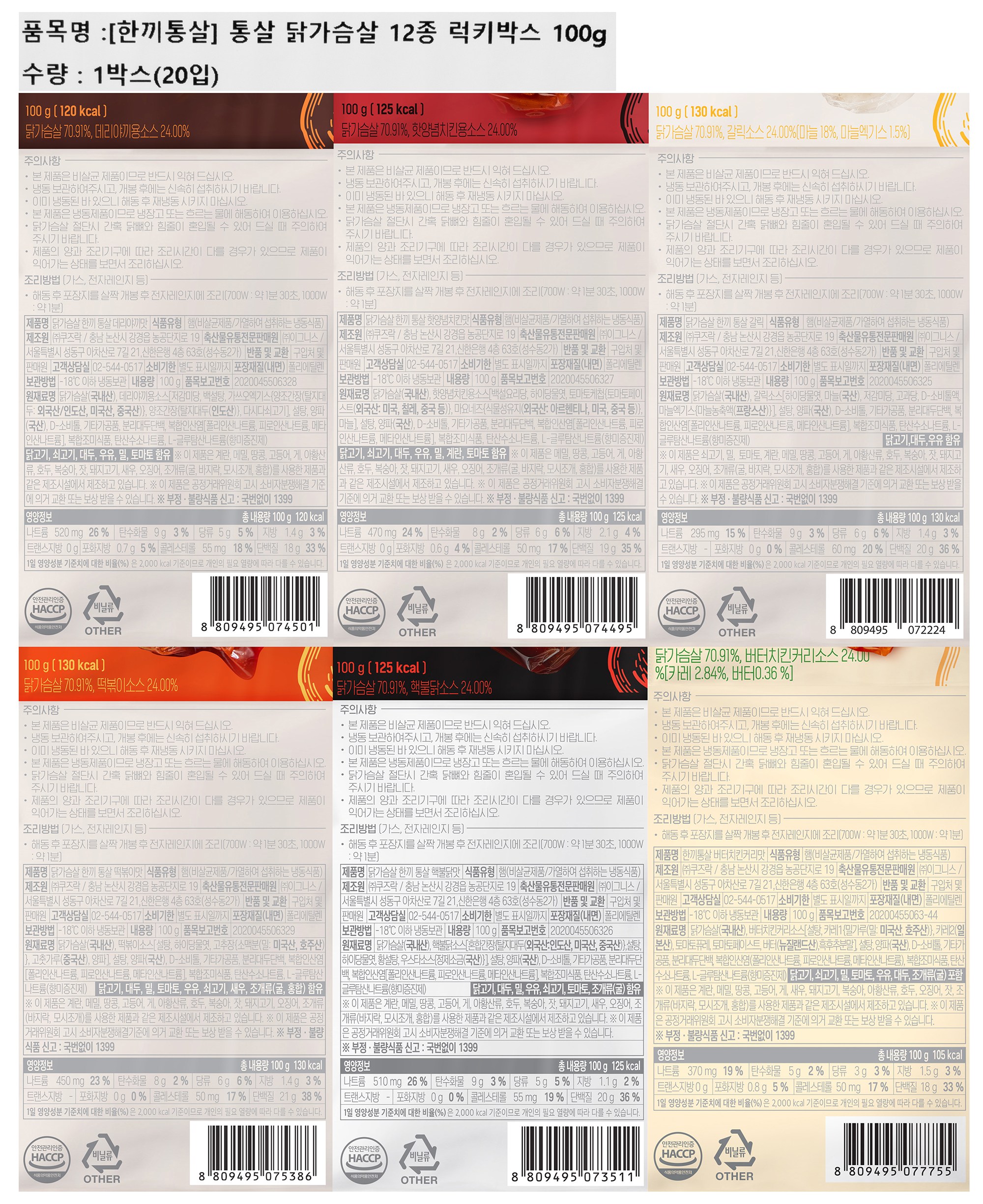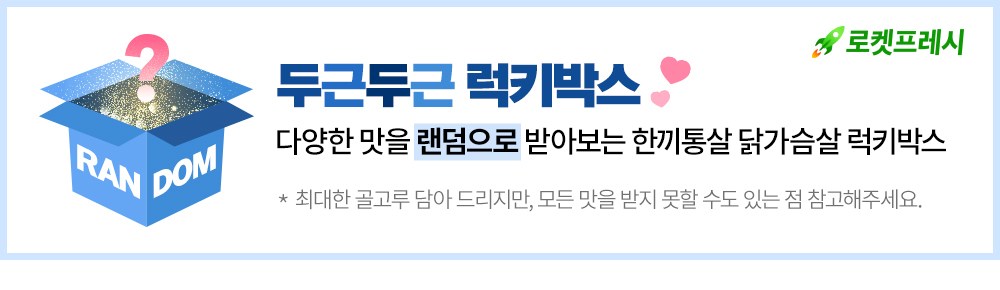 닭가슴살 맛을 일일이 고르지 않아도, 다양한 맛을 먹어볼 수 있는 럭키박스예요. 소스를 더해 부드럽고 촉촉한 한끼통살들로만 구성했는데요. 상자를 열기 전까진 무슨 맛이 들어있는지 알 수 없어서 더 재미있죠. 매번 똑같은 닭가슴살을 먹는 데 질렸다면, 두근두근 럭키박스와 함께해보세요!