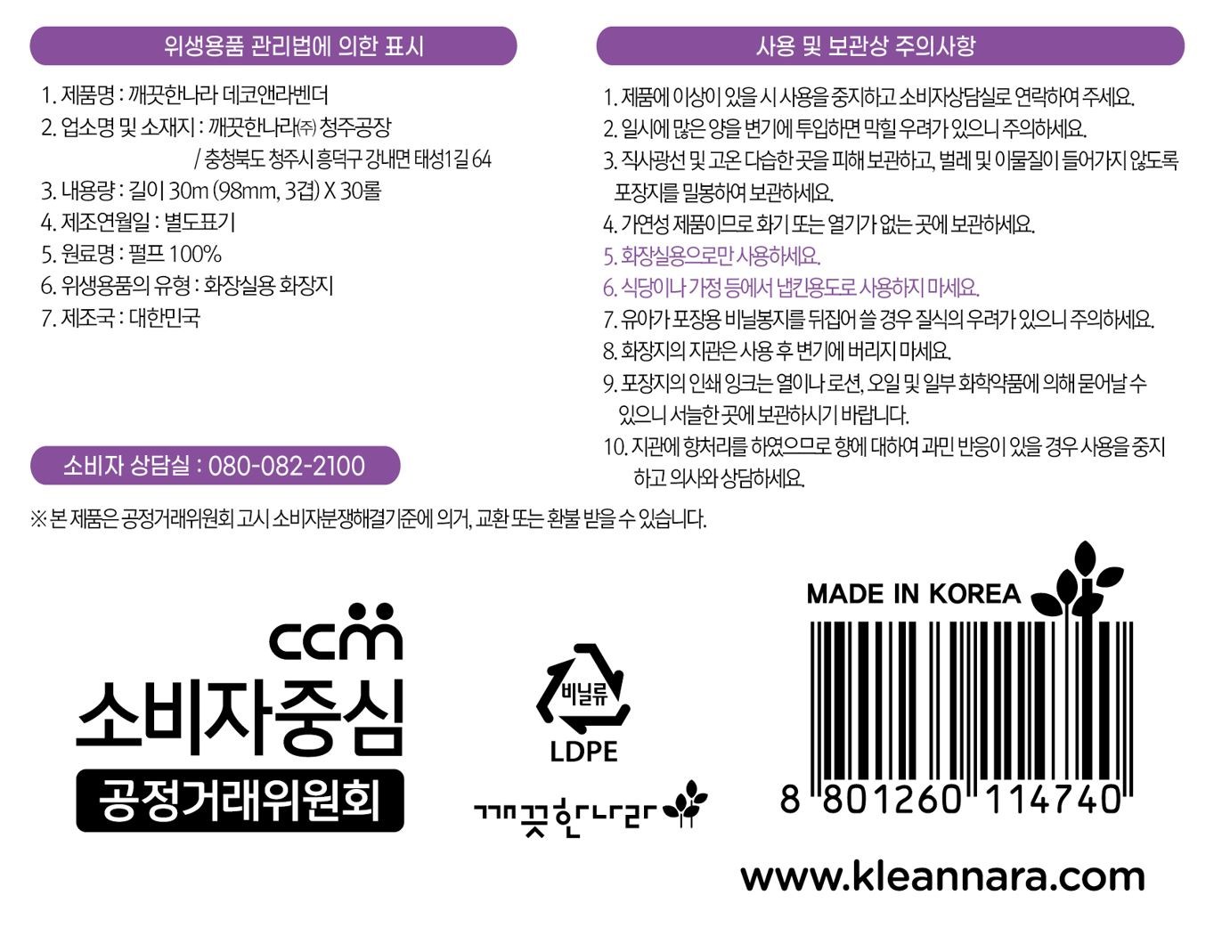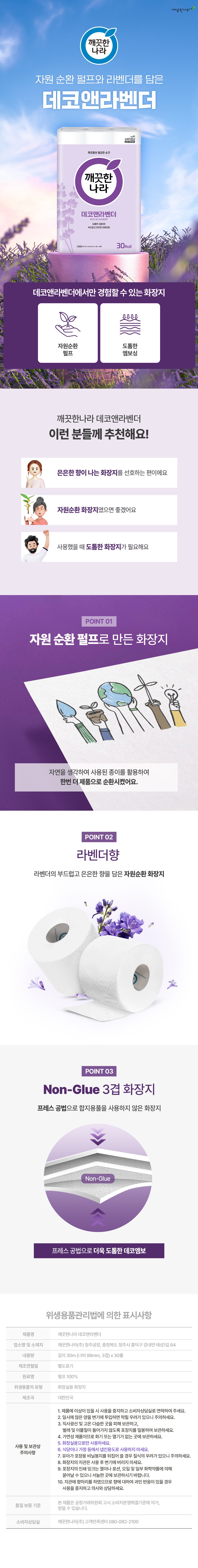 | 품명 및 모델명 | 깨끗한나라 3겹 데코앤라벤더 롤화장지 30m | 인증/허가 사항 | 위생용품 |