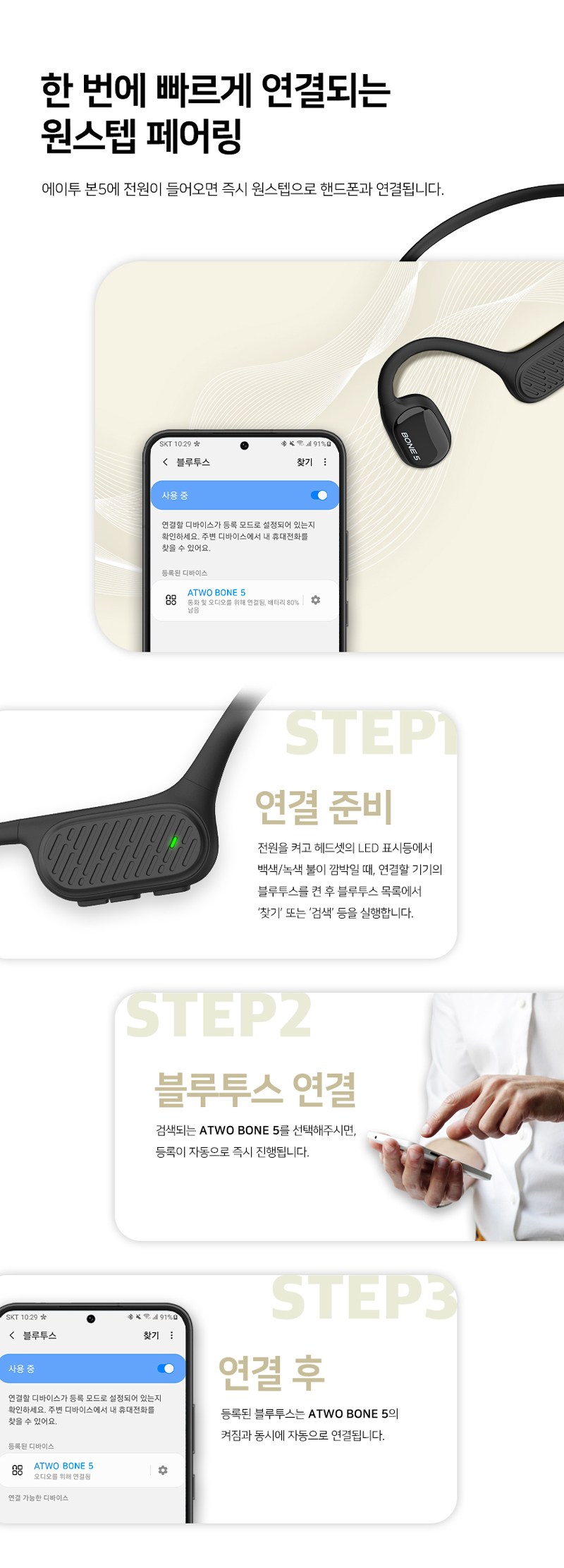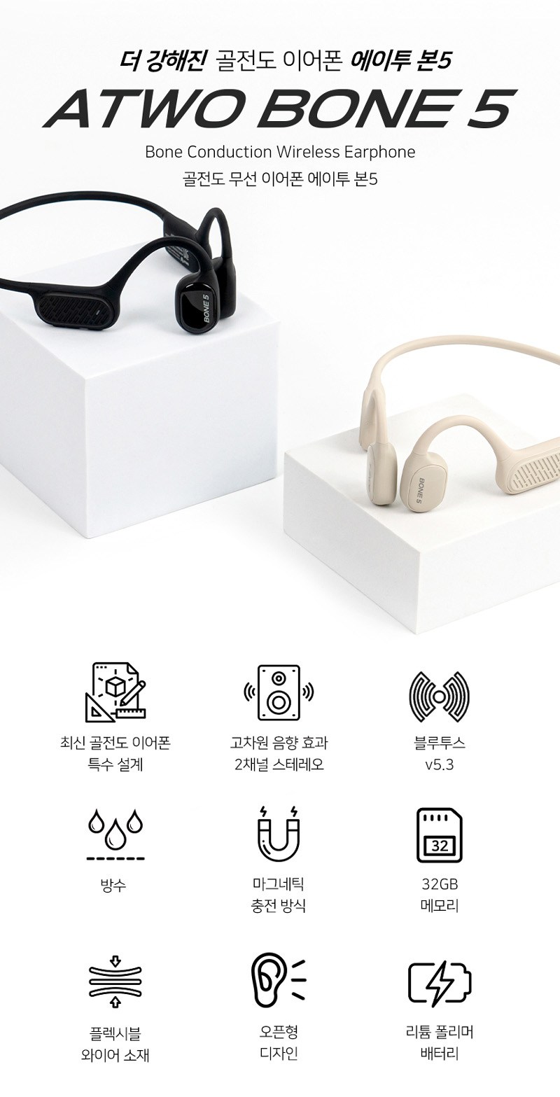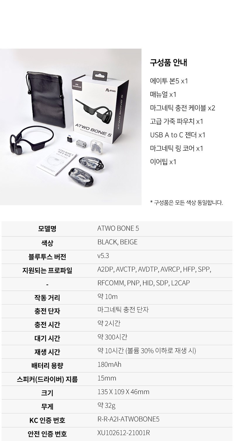 | 품명 및 모델명 | 골전도무선이어폰 / ATWO BONE 5 | KC 인증정보 | 본품: R-R-A2I-ATWOBONE5, 전지: XU102612-21001R |