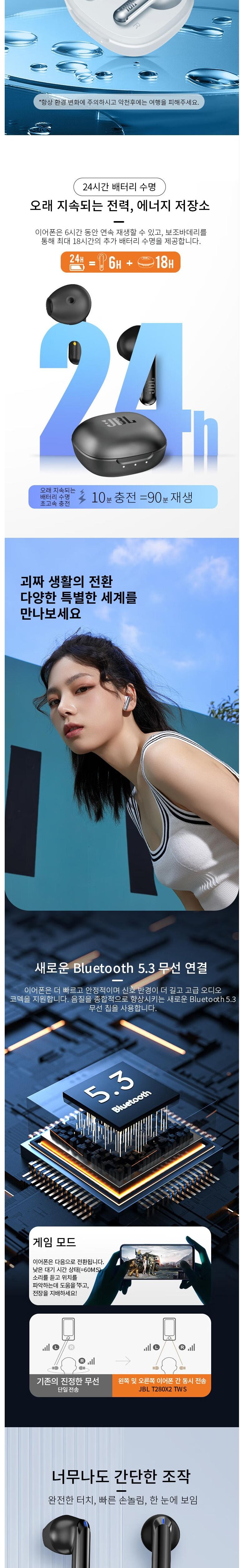 JBL T280TWS X2 헤드폰 1개, 충전 케이스 1개, USB Type-c 충전 케이블 1개, 보증서ㅣ사운드 워닝 카드ㅣROHS 카드 1부, 빠른 시작 가이드 1부