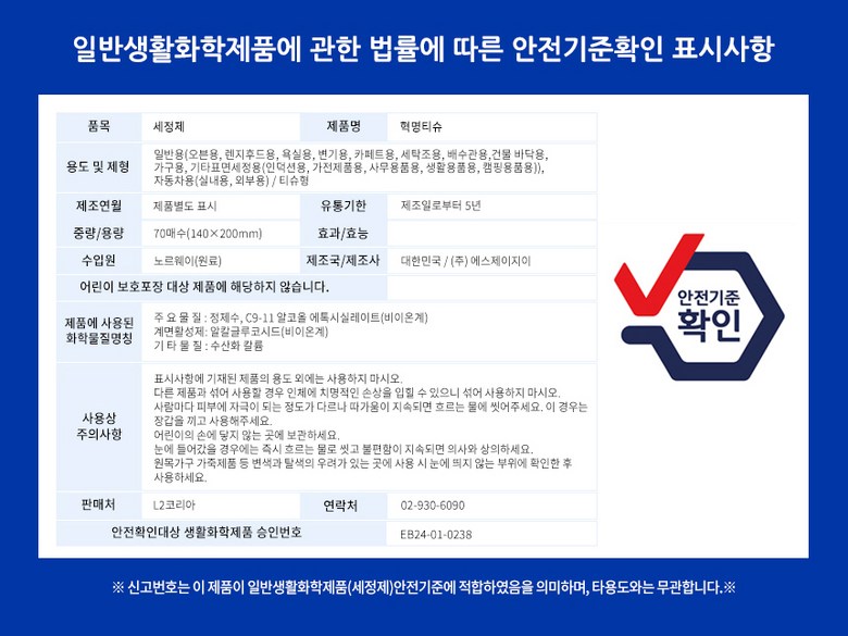 | 품명 및 모델명 | 혁명티슈 70매 | 인증/허가 사항 | 상세설명참조 |