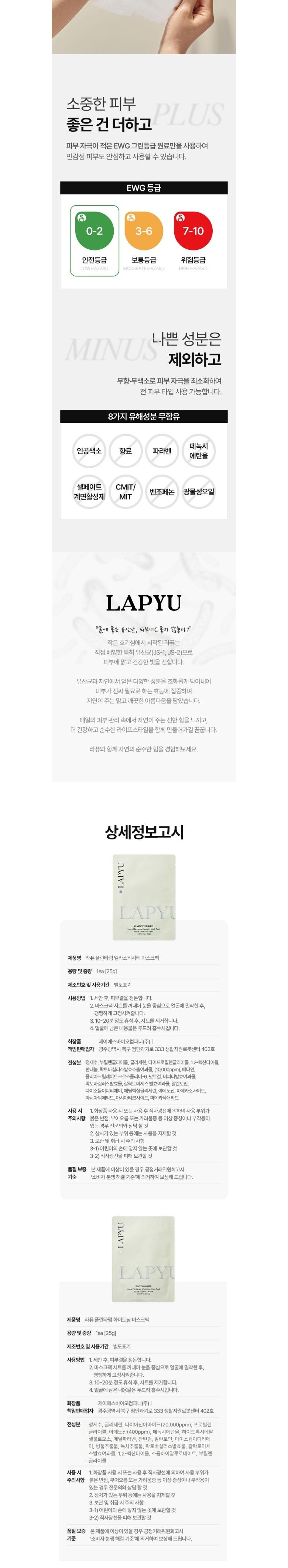 | 용량(중량) | 25g, 100매, 1box | 제품 주요 사양 | 모든 피부용 / 기능성 화장품(미백, 주름개선) |