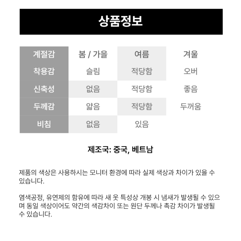 | 제조국 | 중국 | 세탁방법 및 취급시 주의사항 | 단독세탁 권장 |