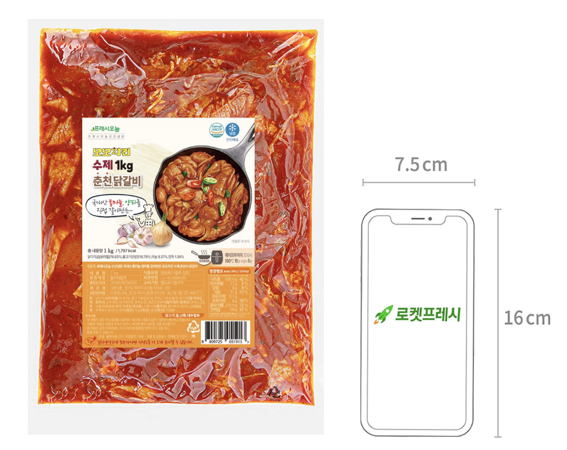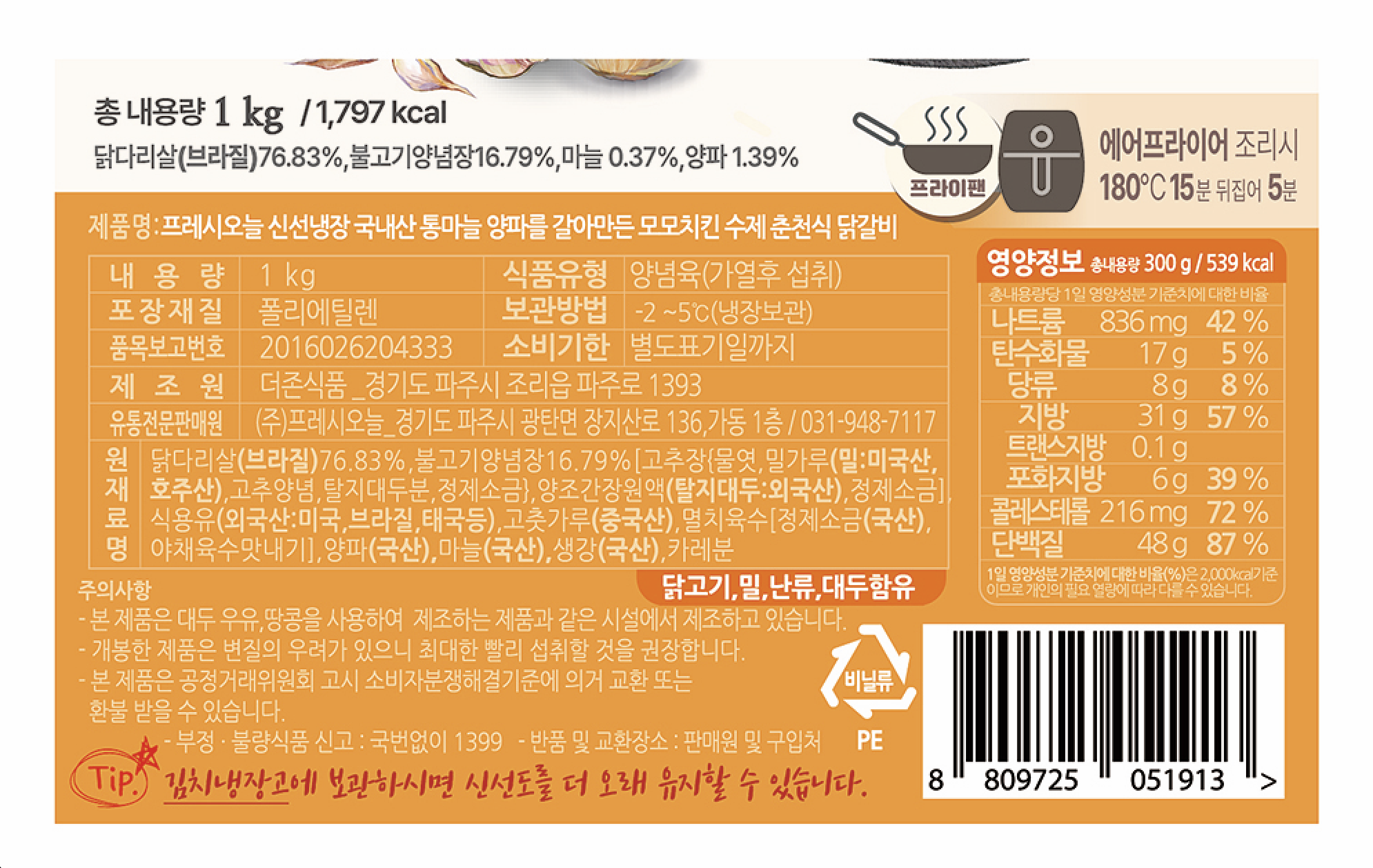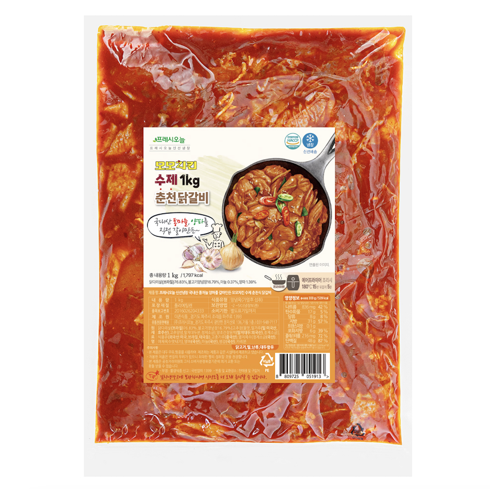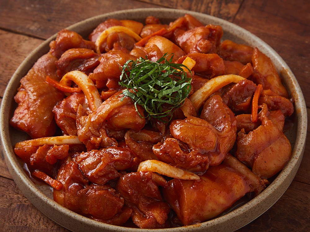 에어프라이어나 프라이팬으로 조리하는 닭갈비예요. 야들야들한 닭다리살에 매콤한 풍미가 쏙쏙 배었는데요. 통마늘, 양파를 갈아 만들어 깊은 풍미를 자랑합니다. 그대로 먹어도 맛있고, 취향껏 고구마, 떡을 같이 넣고 조리해도 좋아요.