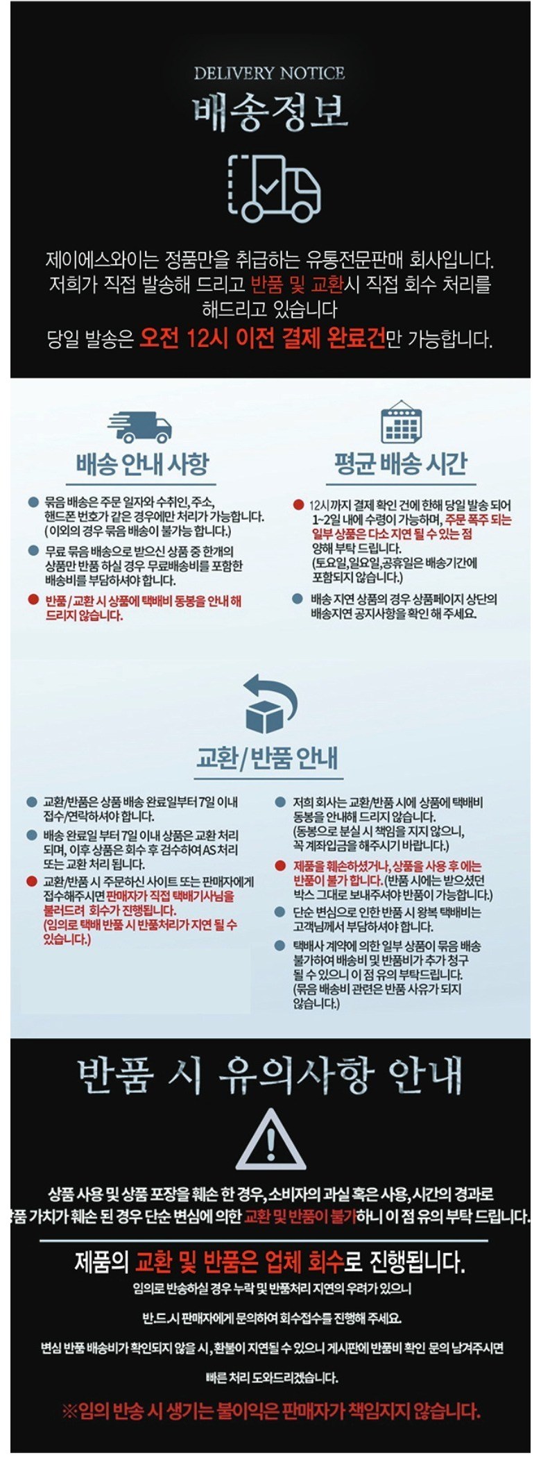 - ㆍ교환/반품에 관한 일반적인 사항은 판매자가 제시사항보다 관계법령이 우선합니다.