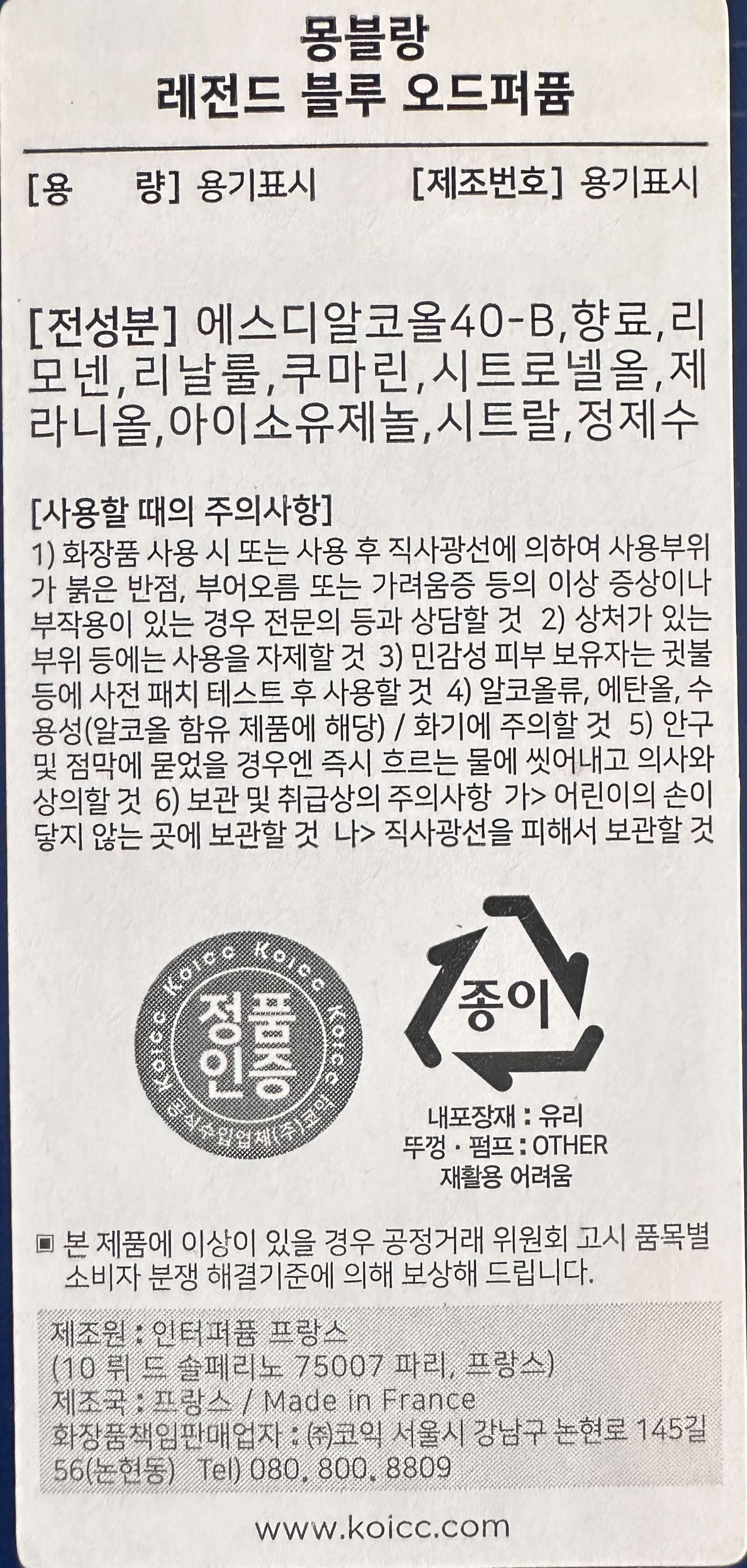 | 화장품제조업자, 화장품책임판매업자 및 맞춤형화장품판매업자 | 컨텐츠 참조 | 제조국 | 프랑스 |