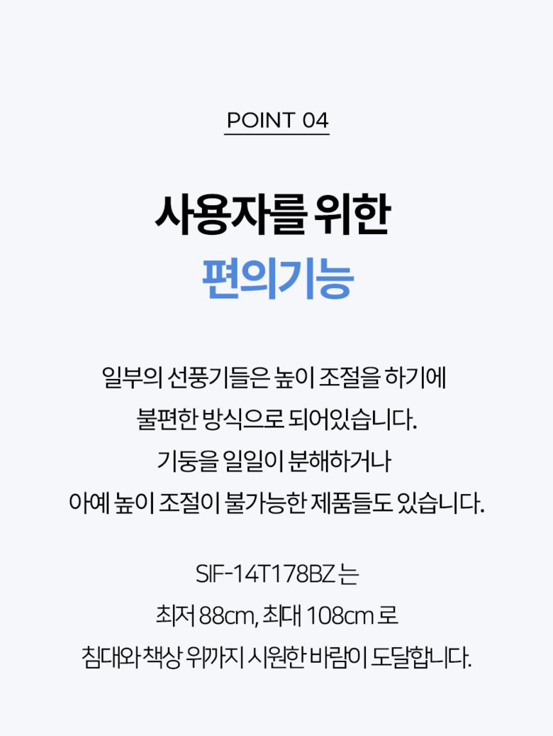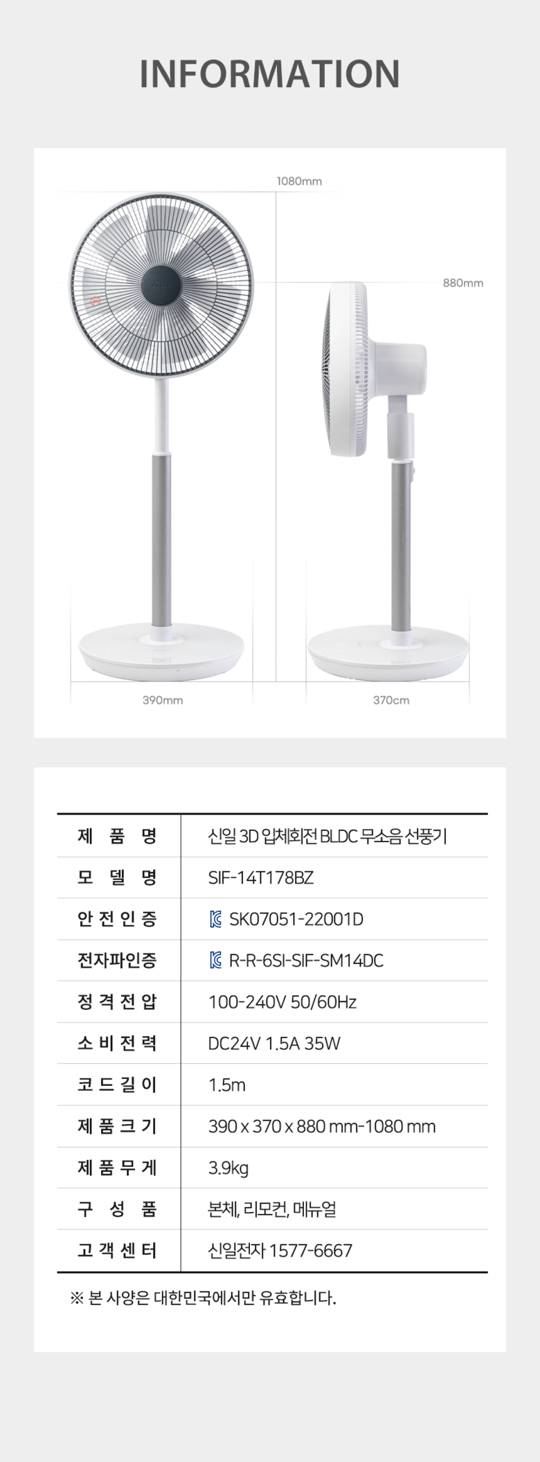 | 품명 및 모델명 | 신일 무소음 bldc 선풍기 / SIF-14T178BZ | KC 인증정보 | SK07051-22001D |