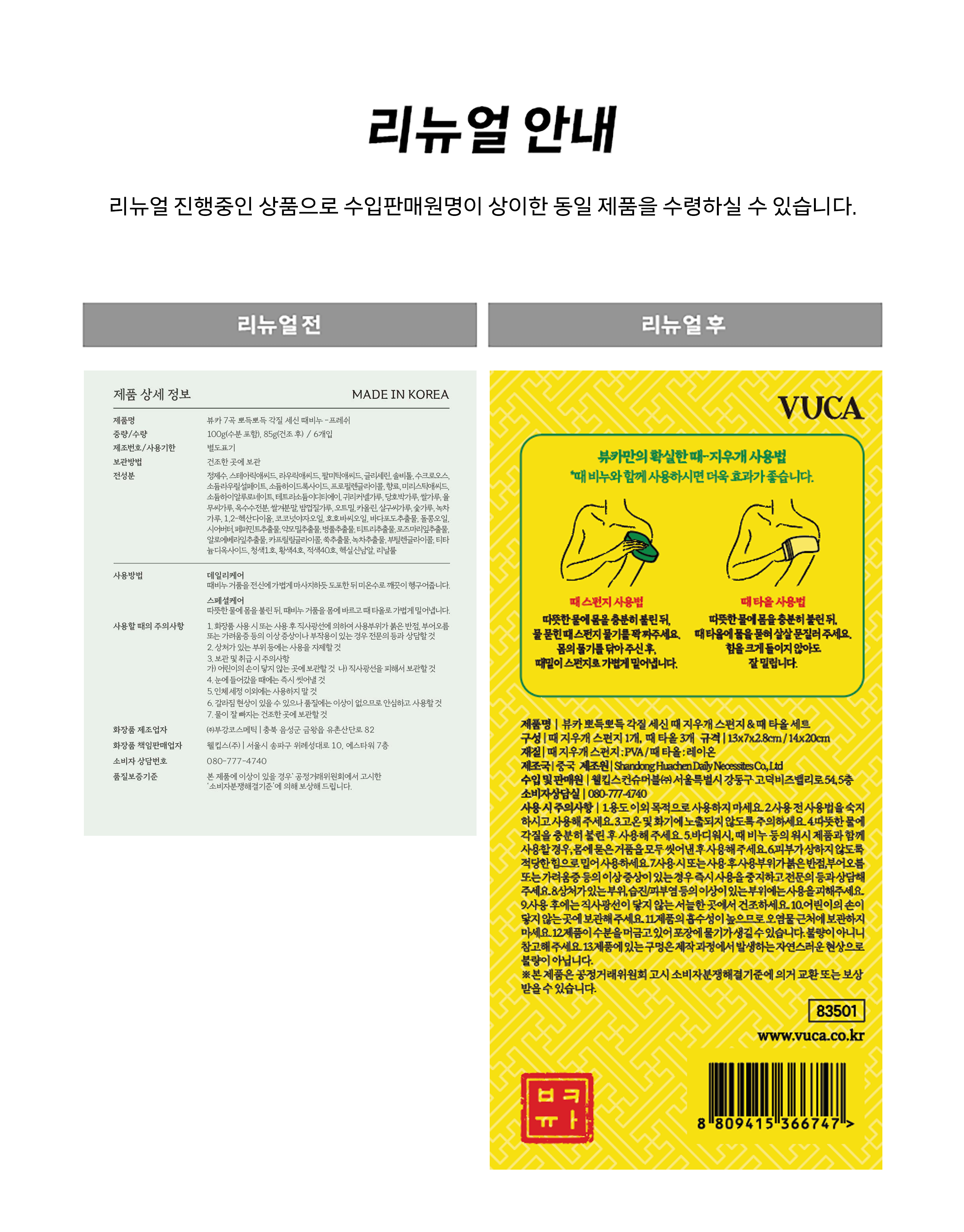 | 품명 및 모델명 | 뷰카 뽀득뽀득 세신 때 지우개 스펀지 + 때 타올 세트 | 인증/허가 사항 | 해당없음 |