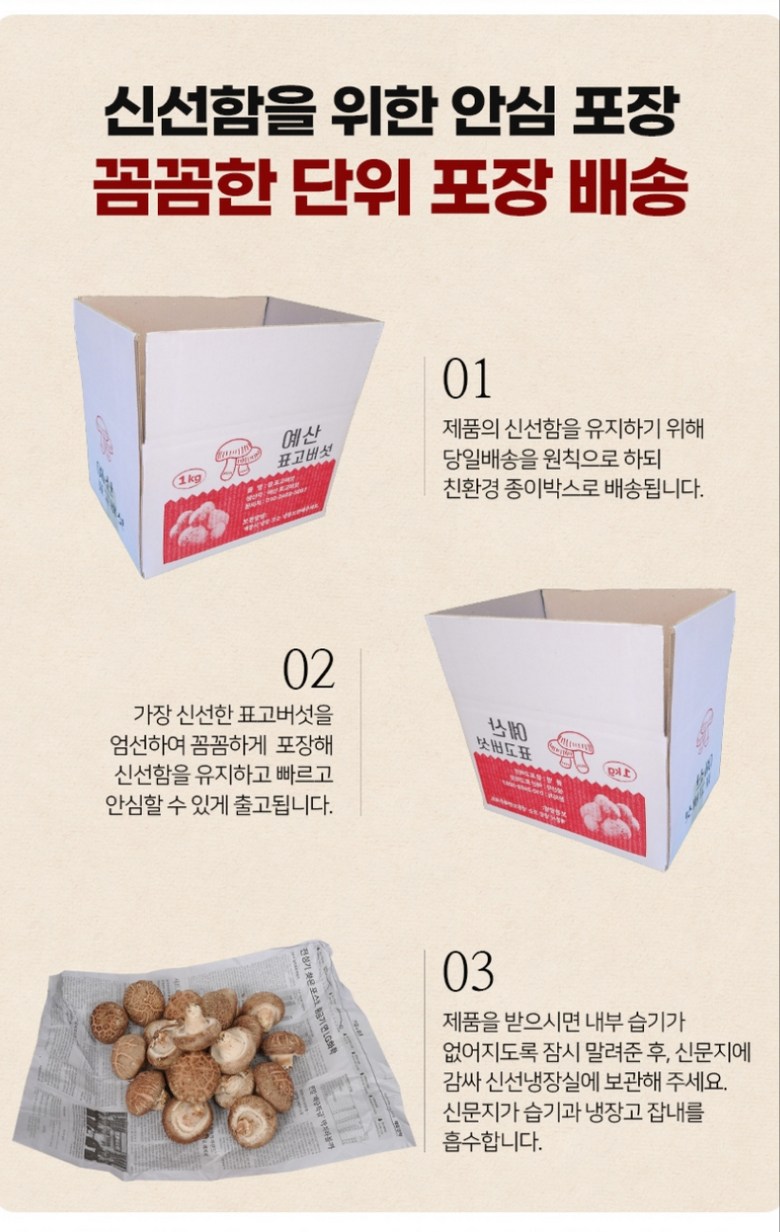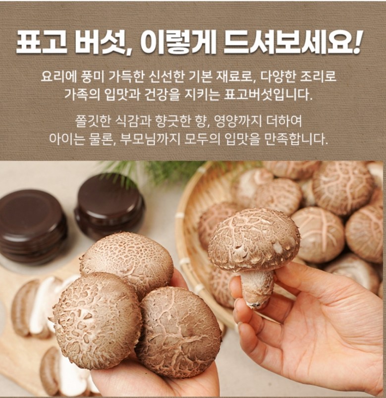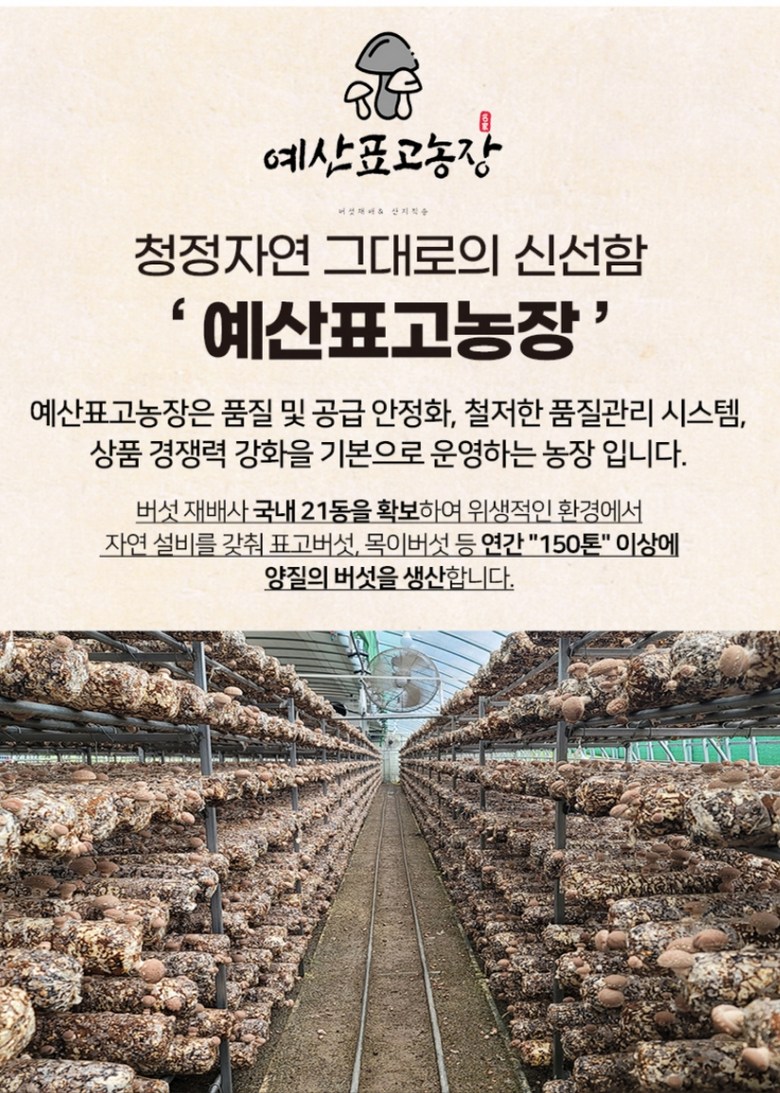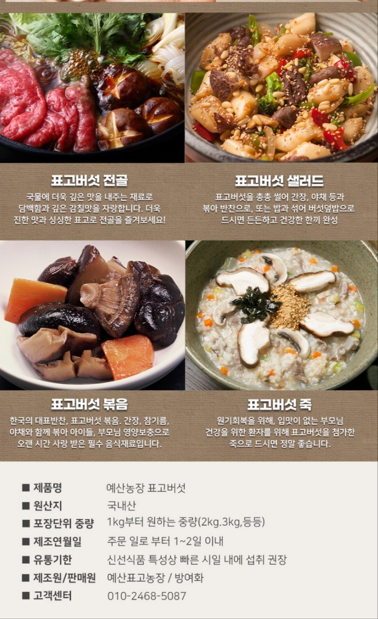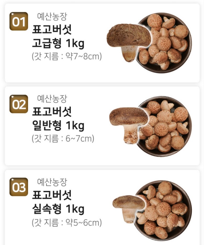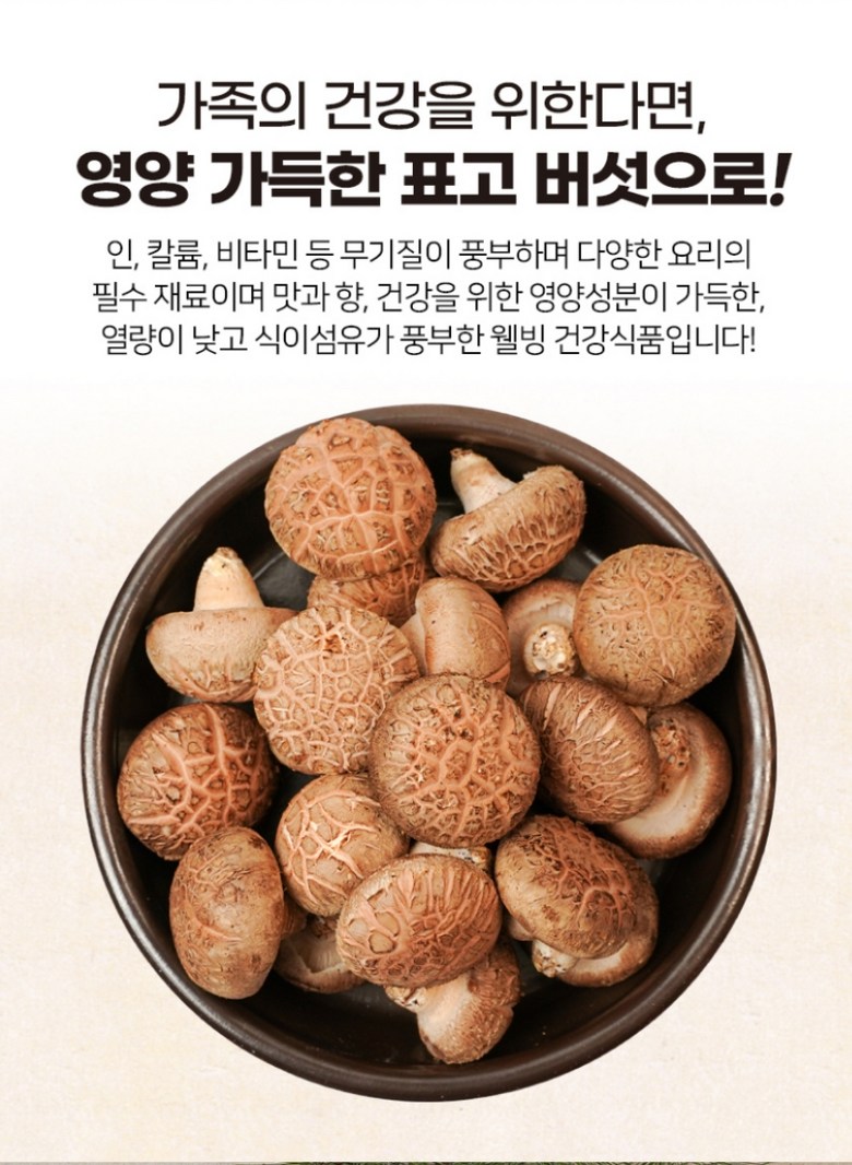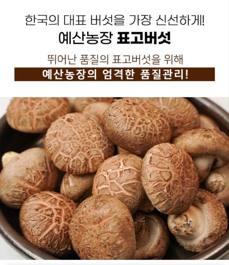 | 품목 또는 명칭 | [예산농장-생 표고버섯] 표고버섯 가정용 못난이 실속형 파지, 대용량 | 포장단위별 내용물의 용량(중량),수량,크기 | 상품 상세페이지 참조 |