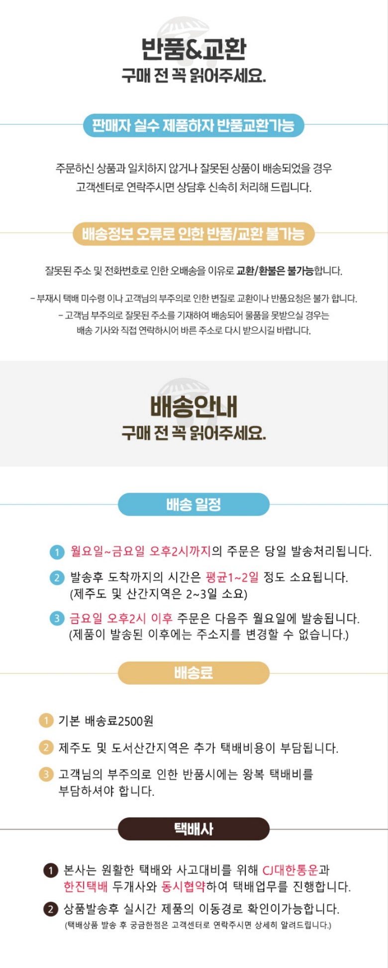 - ㆍ교환/반품에 관한 일반적인 사항은 판매자가 제시사항보다 관계법령이 우선합니다.