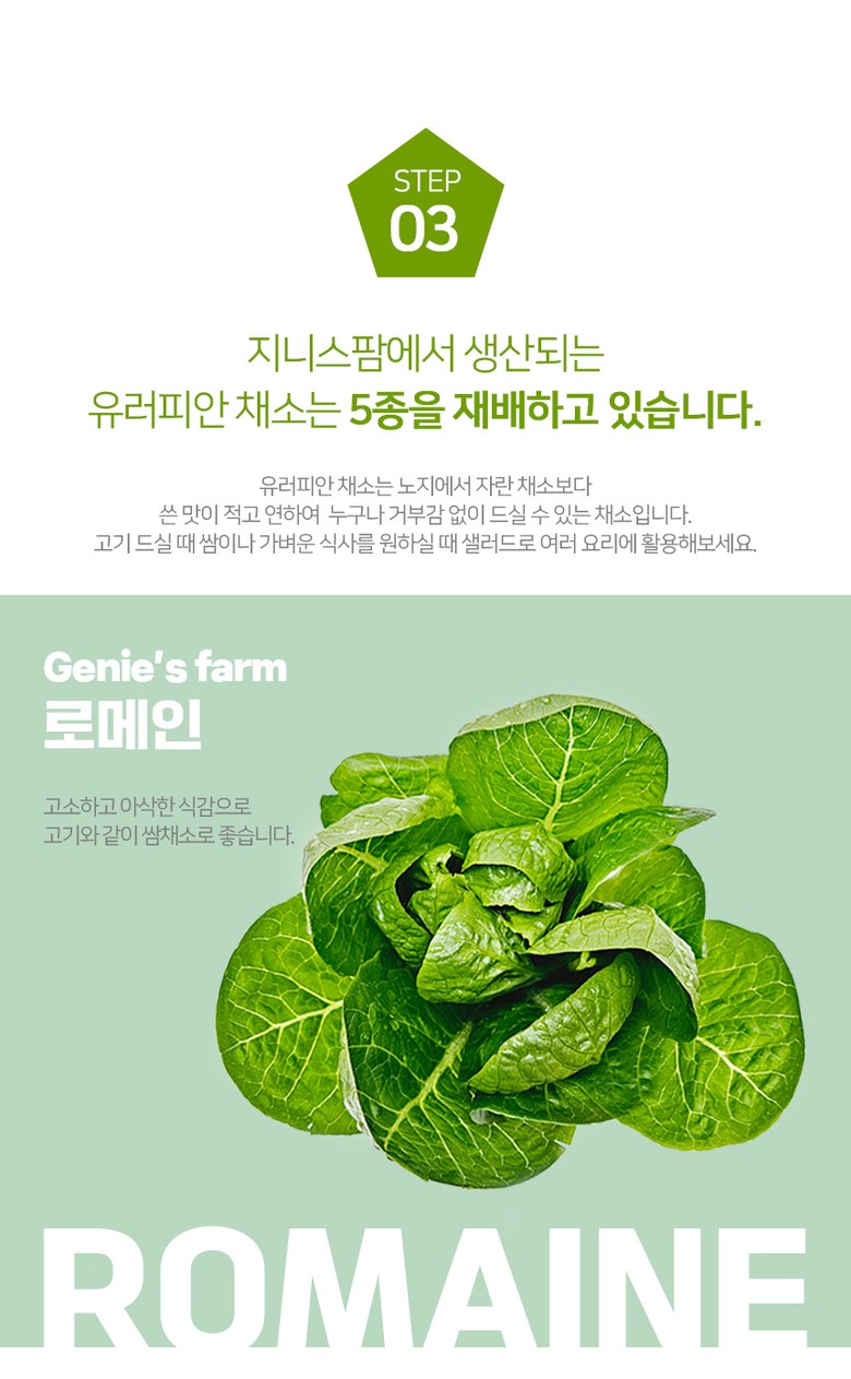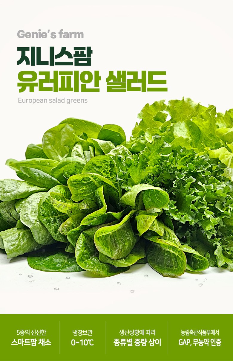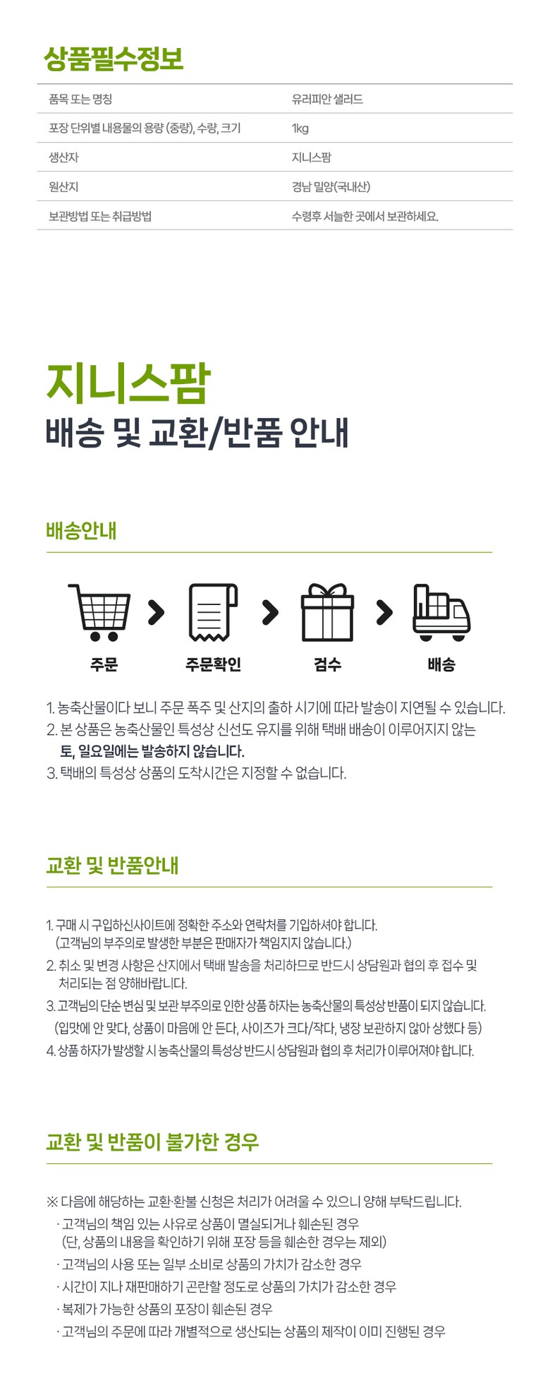 | 품목 또는 명칭 | 지니스팜 유럽형샐러드 1KG | 포장단위별 내용물의 용량(중량),수량,크기 | 상품 상세페이지 참조 |