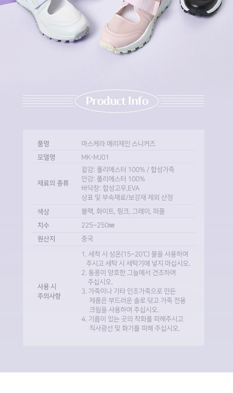| 제품의 주소재(운동화인 경우에는 겉감,안감을 구분하여 표시) | 상품 상세페이지 참조 | 색상 | 상품 상세페이지 참조 |