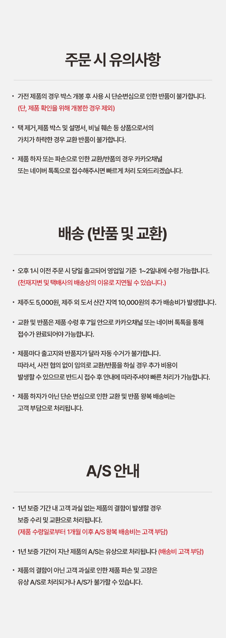 - ㆍ교환/반품에 관한 일반적인 사항은 판매자가 제시사항보다 관계법령이 우선합니다.