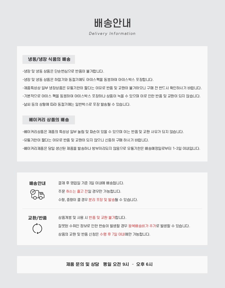 | 배송방법 | 신선/냉장/냉동 | 배송비 | 무료배송 - 도서산간 지역 배송불가 |