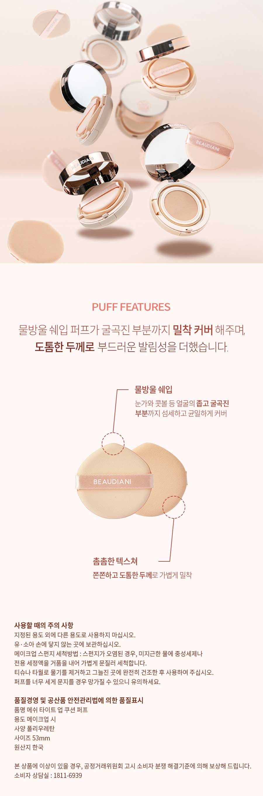 | 품명 및 모델명 | 뷰디아니 메쉬 타이트 업 쿠션 퍼프 10개 | 인증/허가 사항 | 해당없음 |