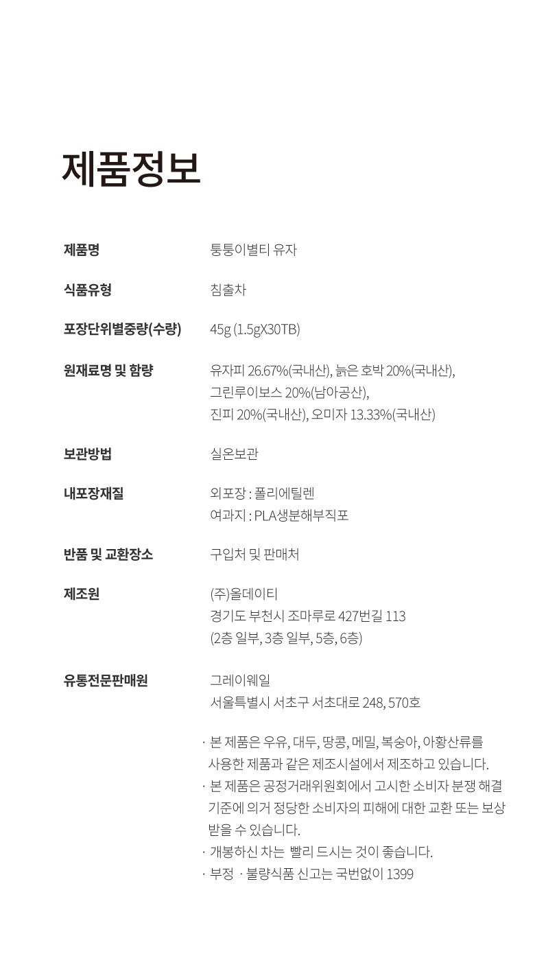 | 생산자 및 소재지 | 상품 상세페이지 참조 | 제조연월일, 소비기한 또는 품질유지기한 | 상품 상세페이지 참조 |