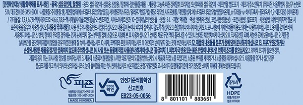 | 품목 및 제품명 | 탈취제,섬유유연제/고농축 피죤 오션후레쉬 | 용도(표백제의 경우 계열을 함께표시) 및 제형 | 섬유유연제-섬유용,신발용/탈취제-일반용(물체용)/액체형 |
