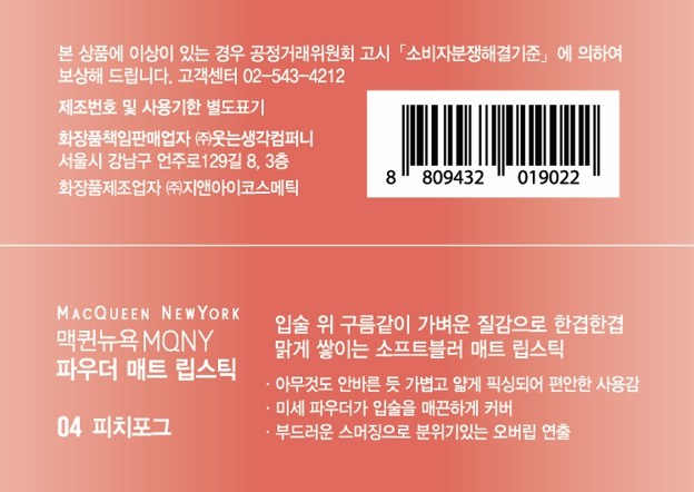 | 화장품제조업자, 화장품책임판매업자 및 맞춤형화장품판매업자 | 컨텐츠 참조 | 제조국 | 대한민국 |