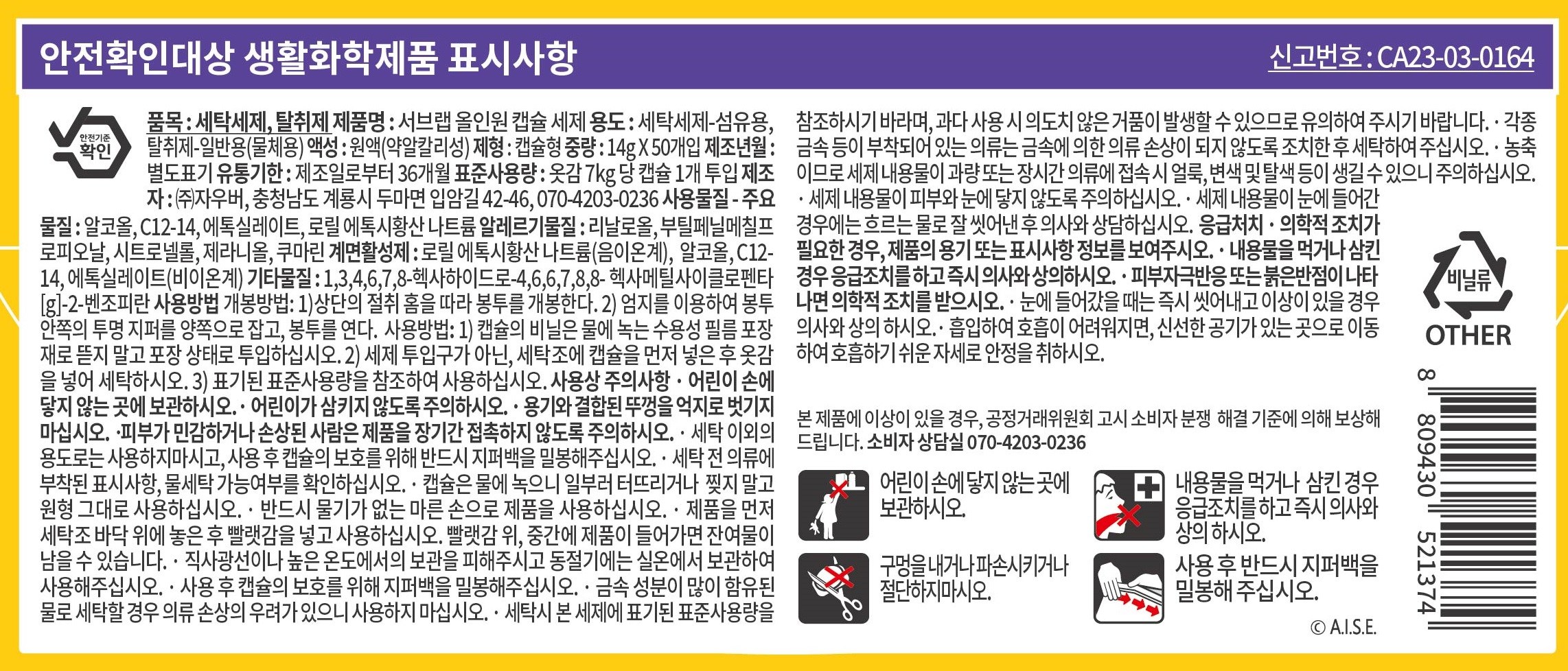 | 품목 및 제품명 | 세탁세제,탈취제 / 서브랩 올인원 캡슐 세제 | 용도(표백제의 경우 계열을 함께표시) 및 제형 | 섬유용,일반용-물체용 / 비분사형-캡슐형 |