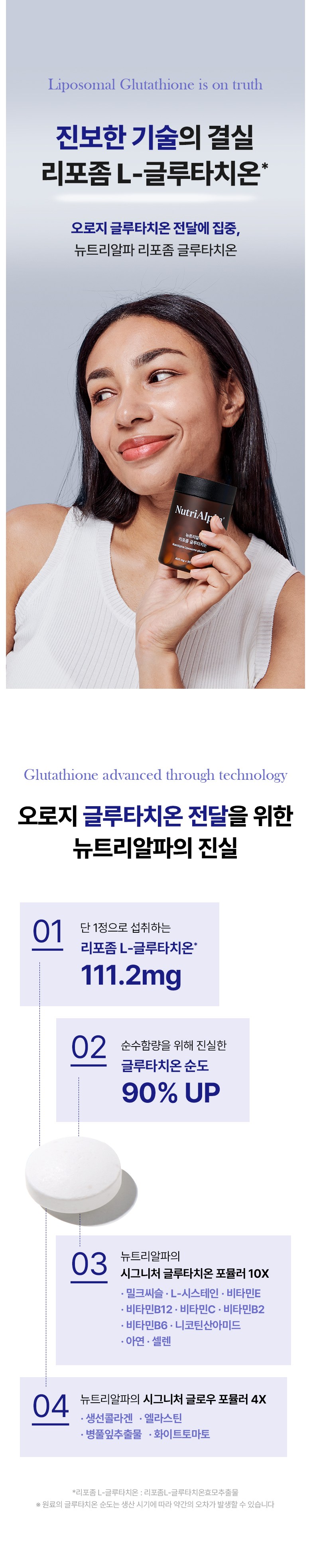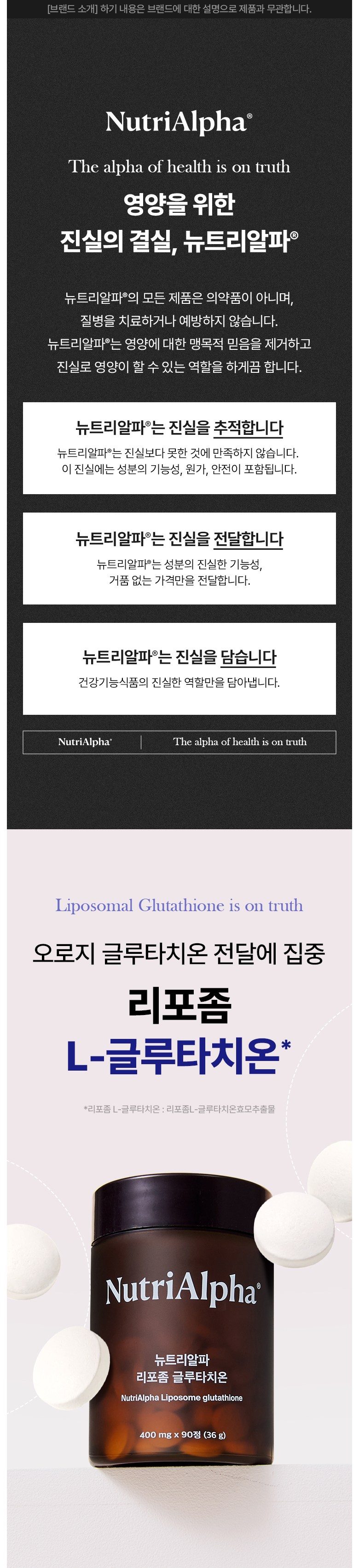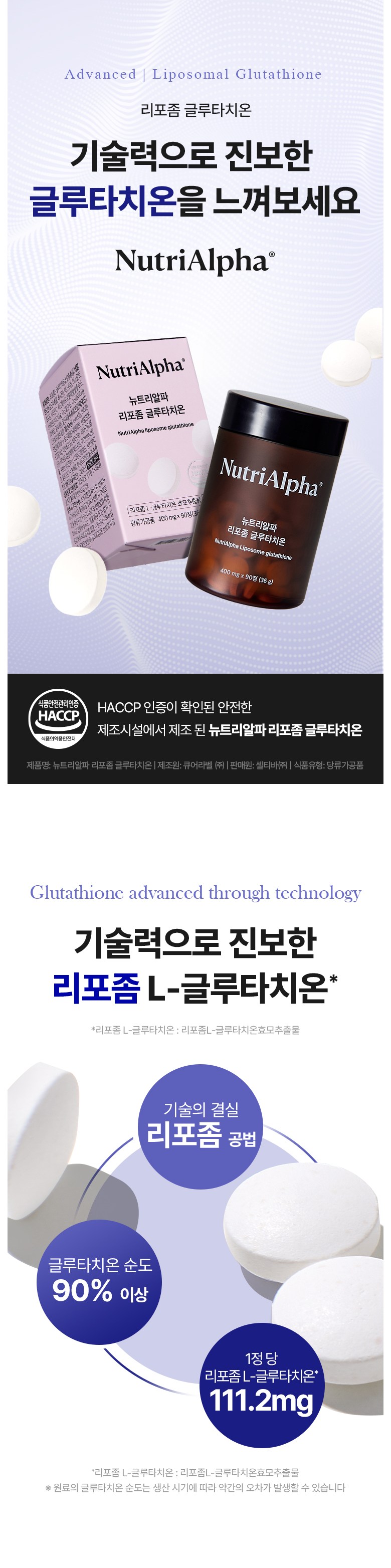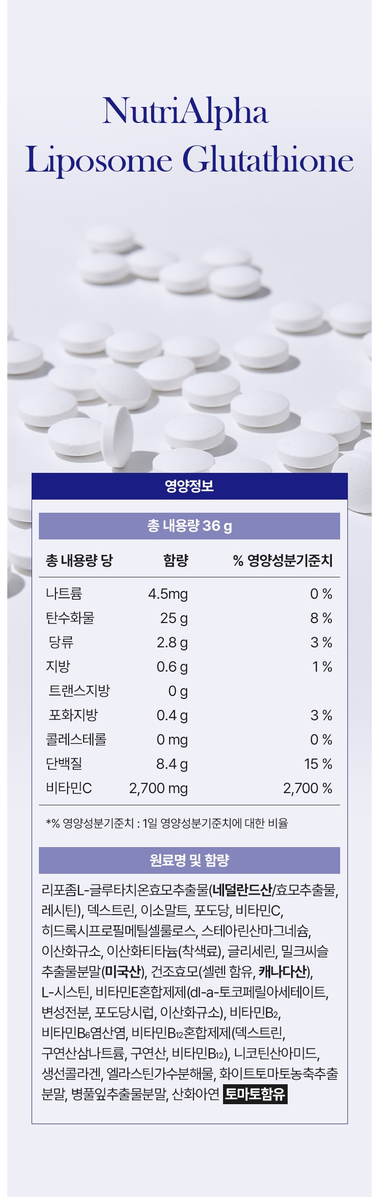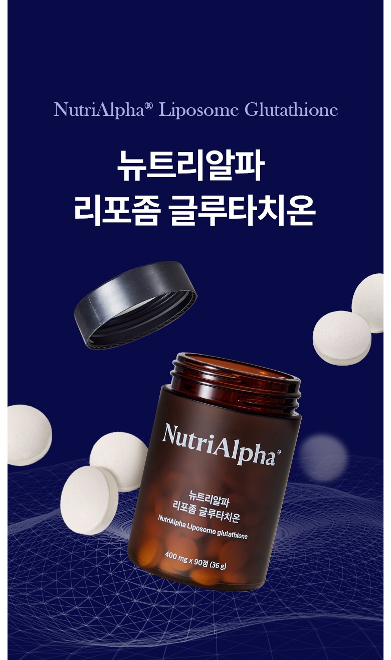 | 품목 또는 명칭 | 뉴트리알파 리포좀 글루타치온 | 포장단위별 내용물의 용량(중량),수량,크기 | 400 mg x 90정 (36 g / 139 kcal) |