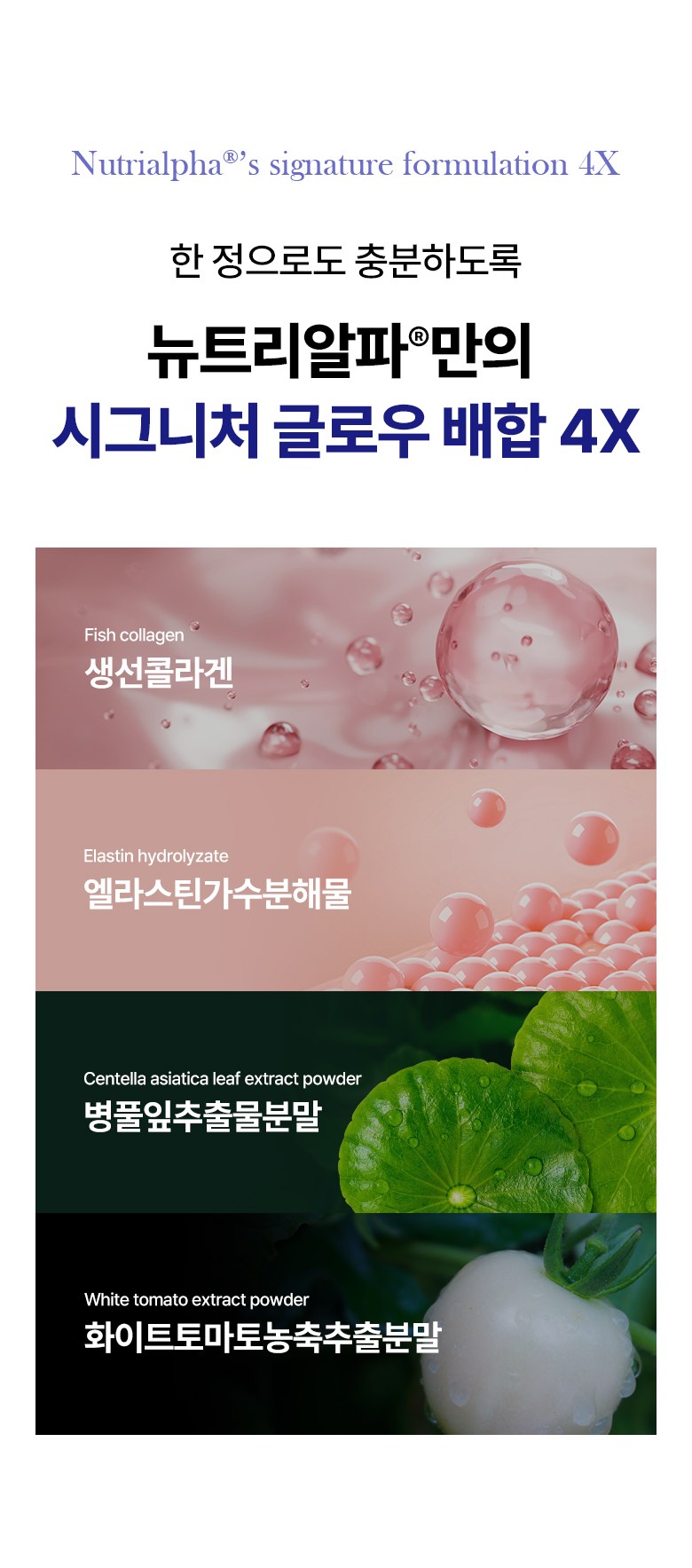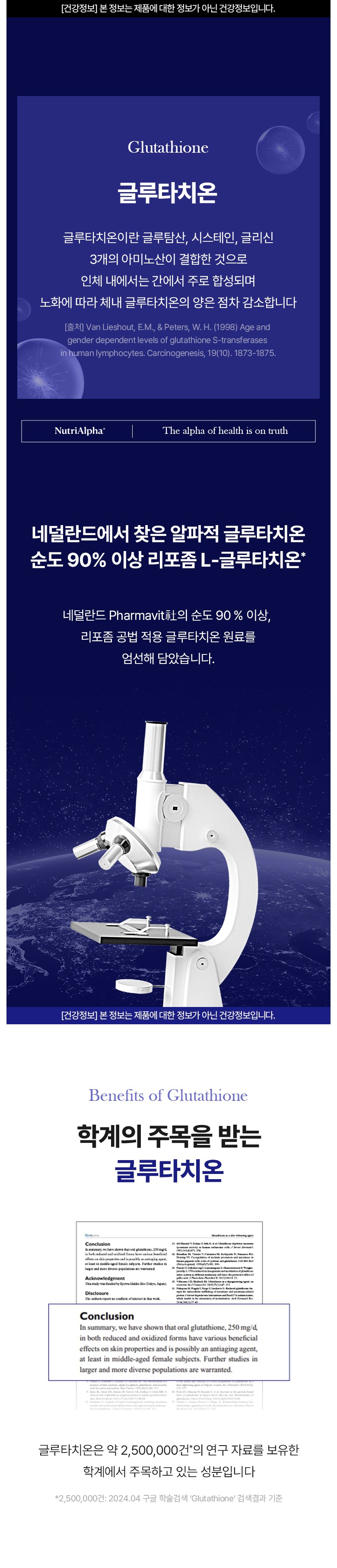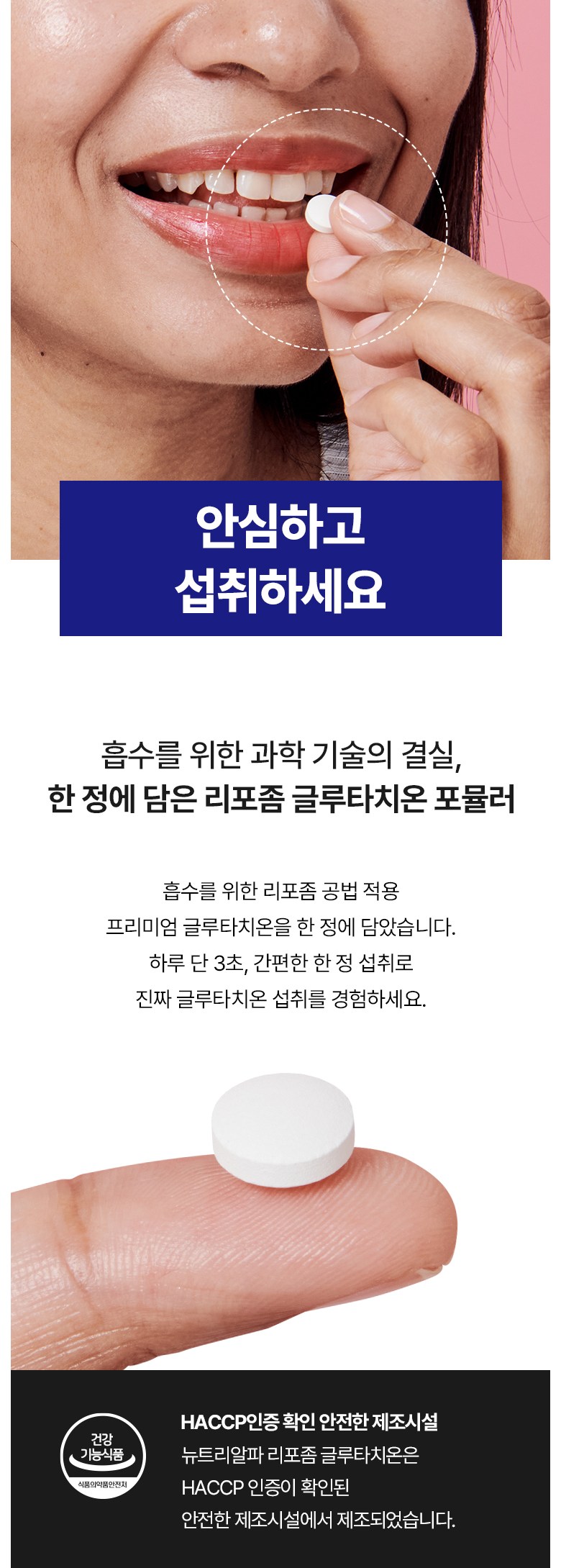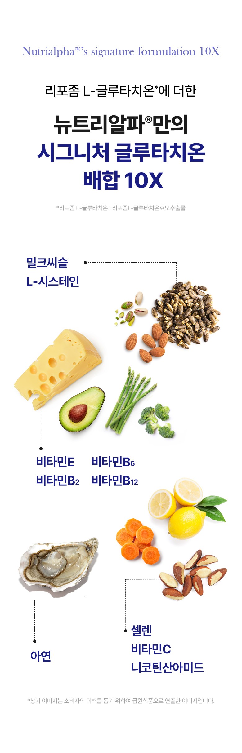 | 품목 또는 명칭 | 뉴트리알파 리포좀 글루타치온 | 포장단위별 내용물의 용량(중량),수량,크기 | 400 mg x 90정 (36 g / 139 kcal) |