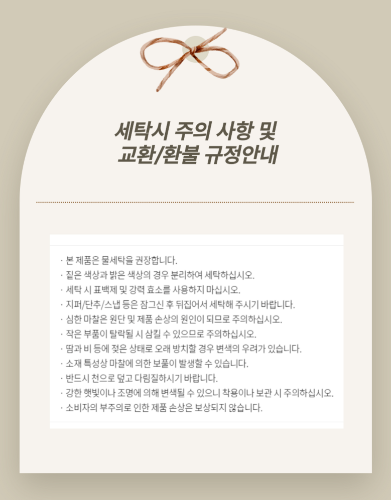 - ㆍ모니터 해상도의 차이로 인해 색상이나 이미지가 실제와 달라, 고객이 단순 변심으로 교환/반품을 무료로 요청하는 경우
