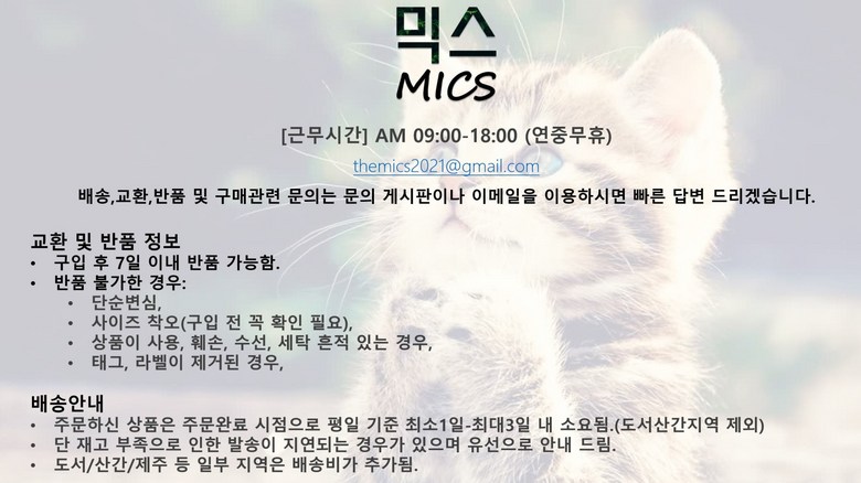 - ㆍ모니터 해상도의 차이로 인해 색상이나 이미지가 실제와 달라, 고객이 단순 변심으로 교환/반품을 무료로 요청하는 경우