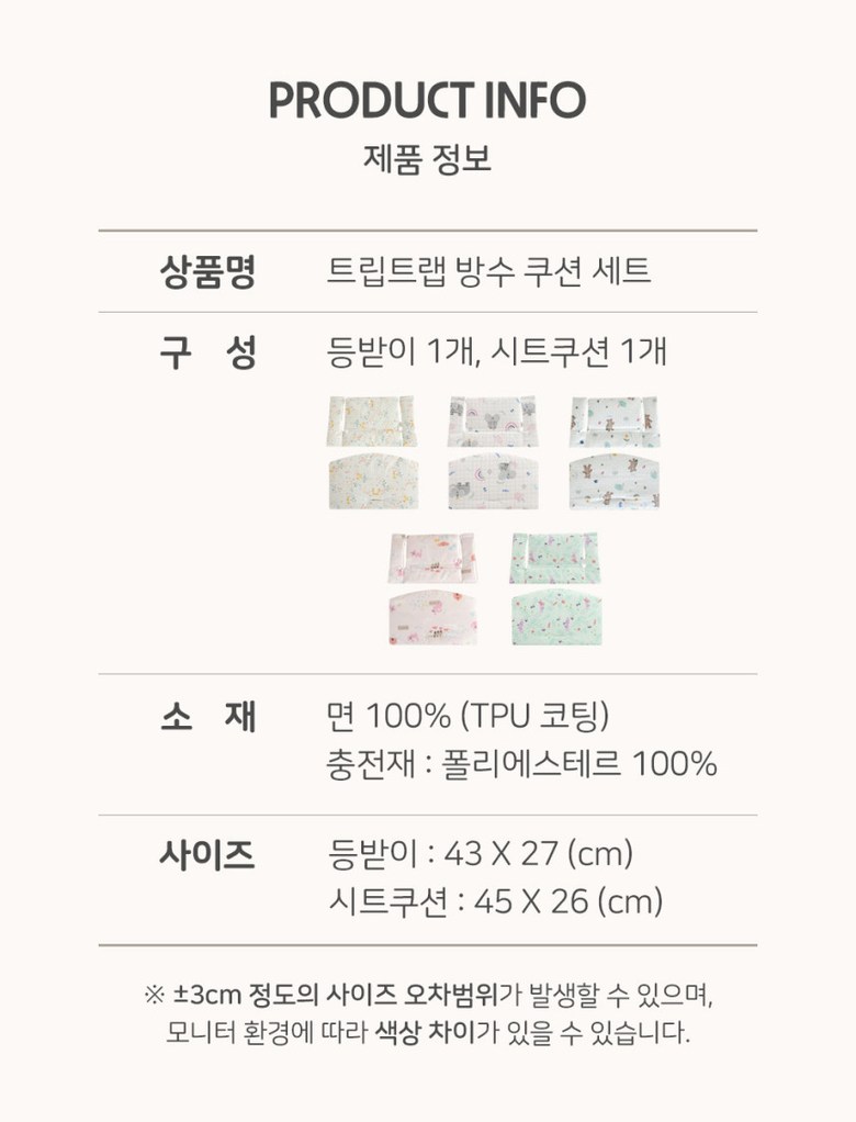 | 품명 및 모델명 | 마롤로뜨 엘마월드 트립트랩 방수 쿠션세트 | 인증/허가 사항 | CB017A187-2004 |