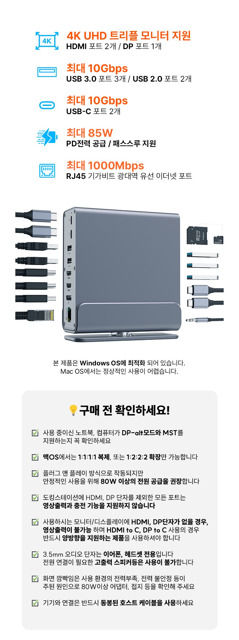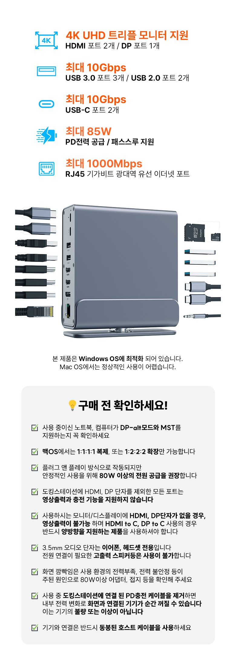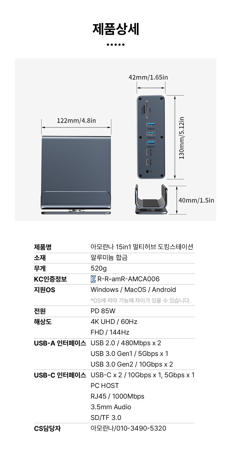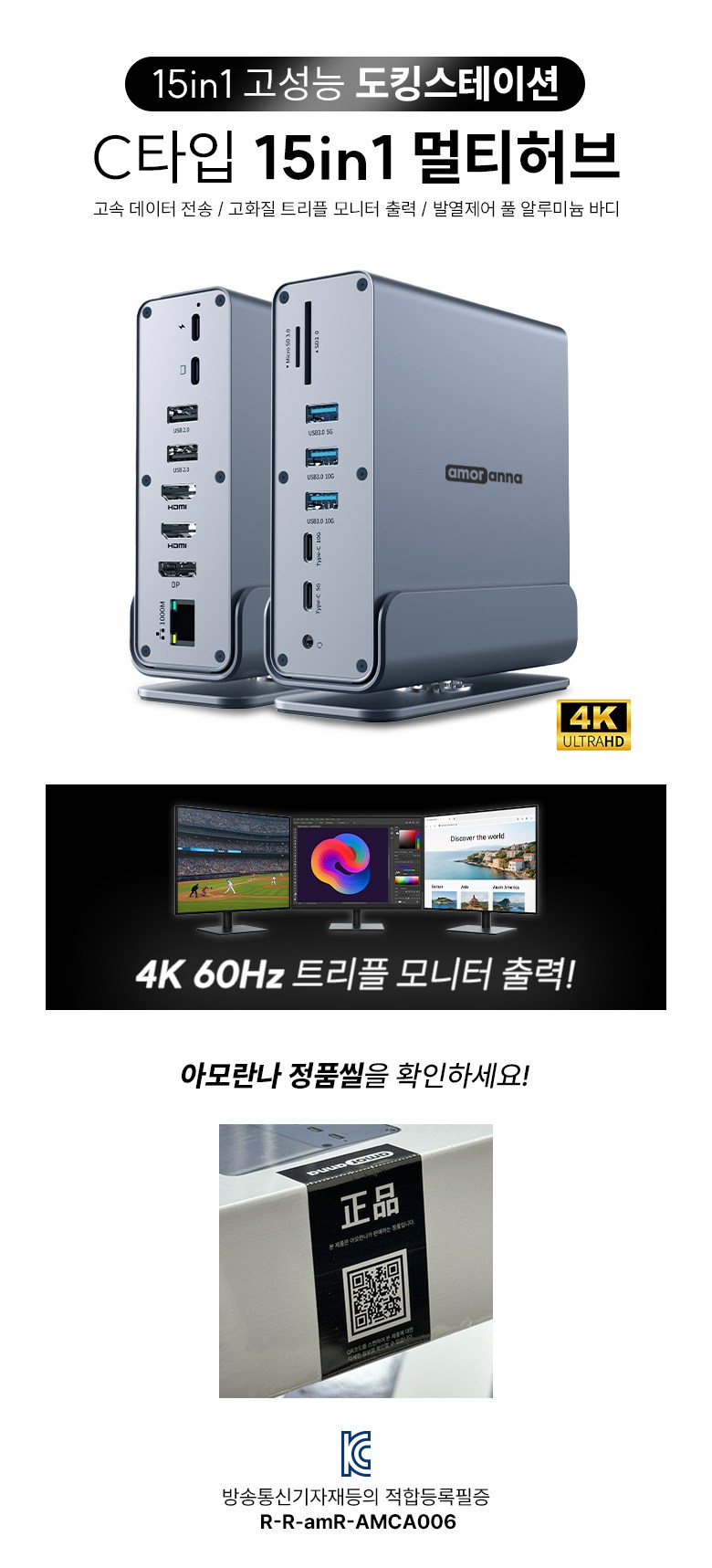 | 품명 및 모델명 | 아모란나 C타입 15in1 멀티 허브 USB4 도킹스테이션 트리플 듀얼 4K 60hz 모니터 | KC 인증정보 | 상품 상세페이지 참조 |