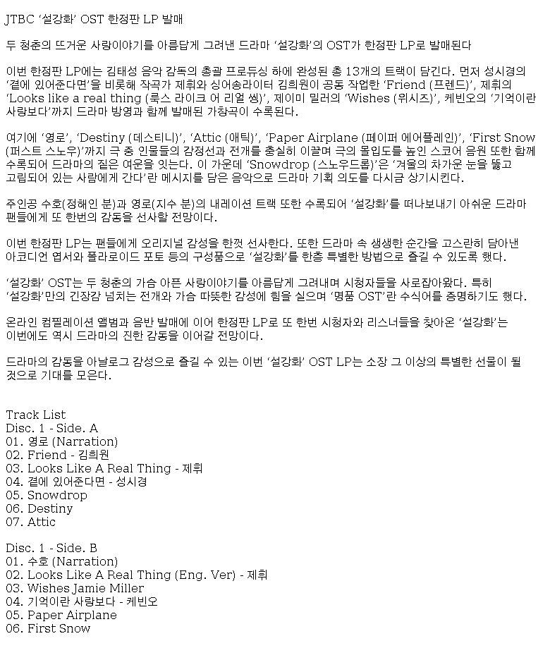 | 품명 및 모델명 | 설강화 : Snowdrop OST 화이트 | 인증/허가 사항 | 해당없음 |