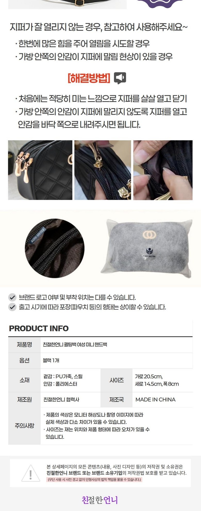 | 종류 | 친절한언니 여성 크로스백 퀄팅백 토트백 숄더 데일리 미니 핸드백 | 소재 | PU가죽, 스테인리스, 폴리에스테르 |