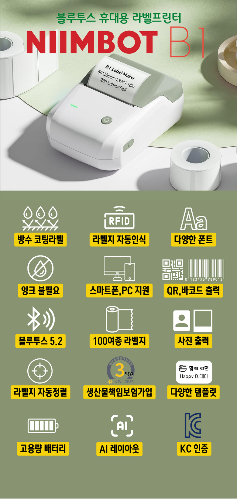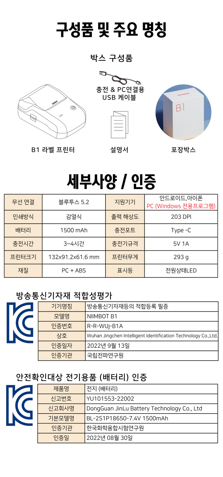 | 품명 및 모델명 | NIIMBOT B1 라벨프린터 | KC 인증정보 | 상품 상세페이지 참조 |