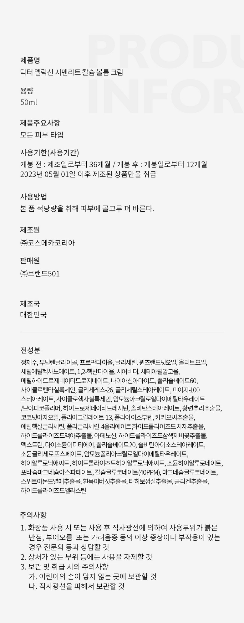 | 용량(중량) | 50ML | 제품 주요 사양 | 모든 피부 타입 |