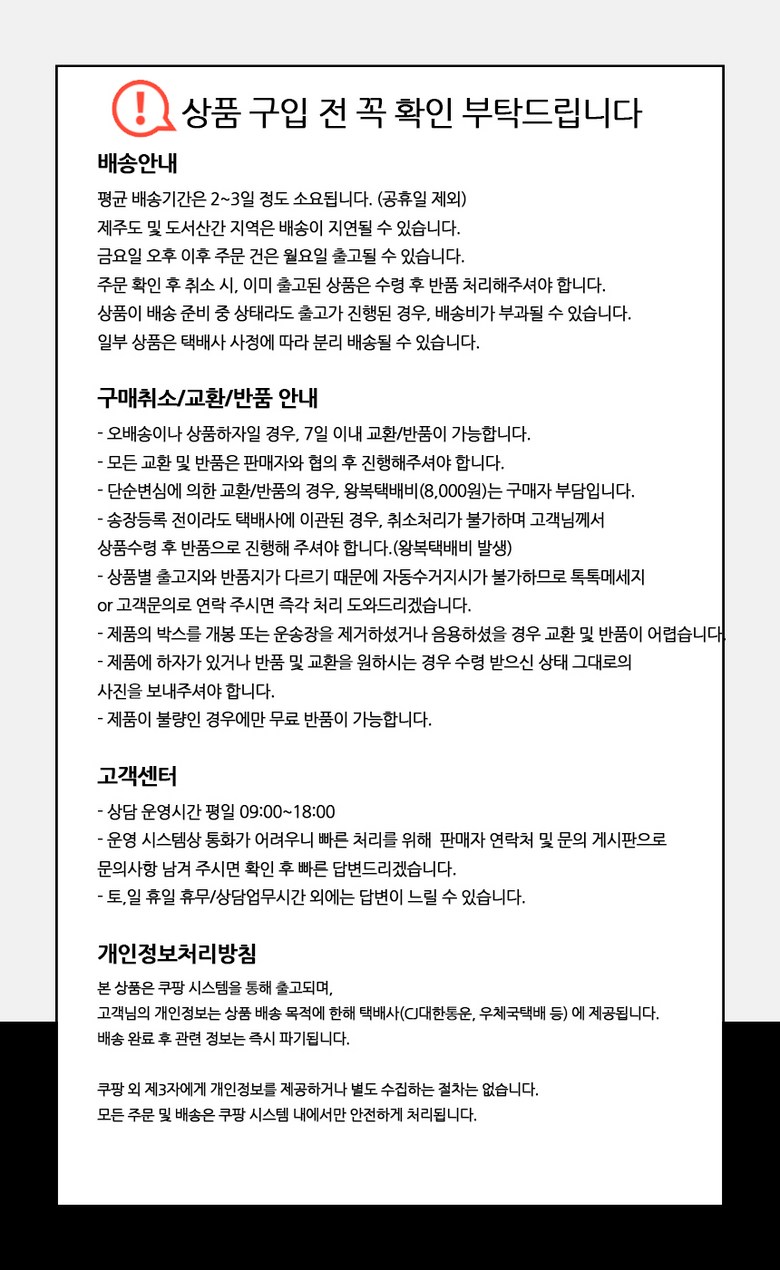 | 교환/반품 비용 (왕복비용) | 8,000원 - 단, 고객 변심의 경우에만 발생 - 도서산간 지역 배송불가 |