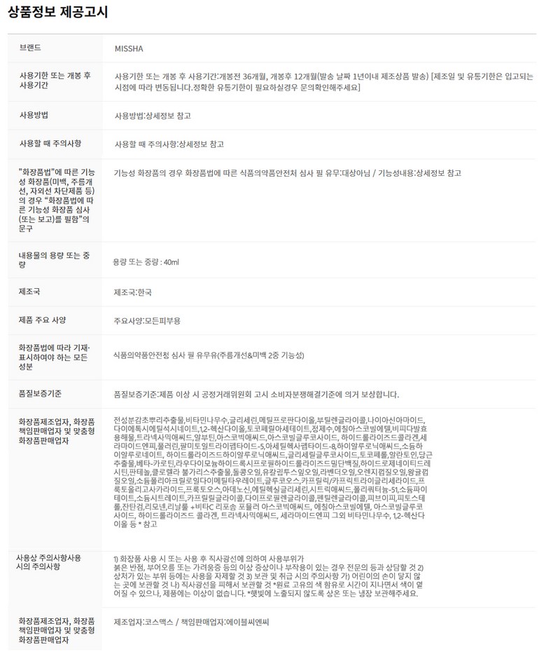 | 화장품제조업자, 화장품책임판매업자 및 맞춤형화장품판매업자 | 상품 상세페이지 참조 | 제조국 | 상품 상세페이지 참조 |