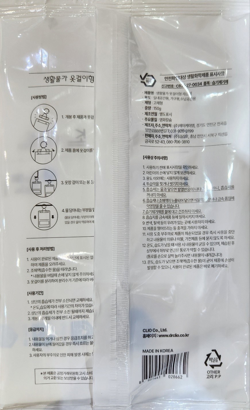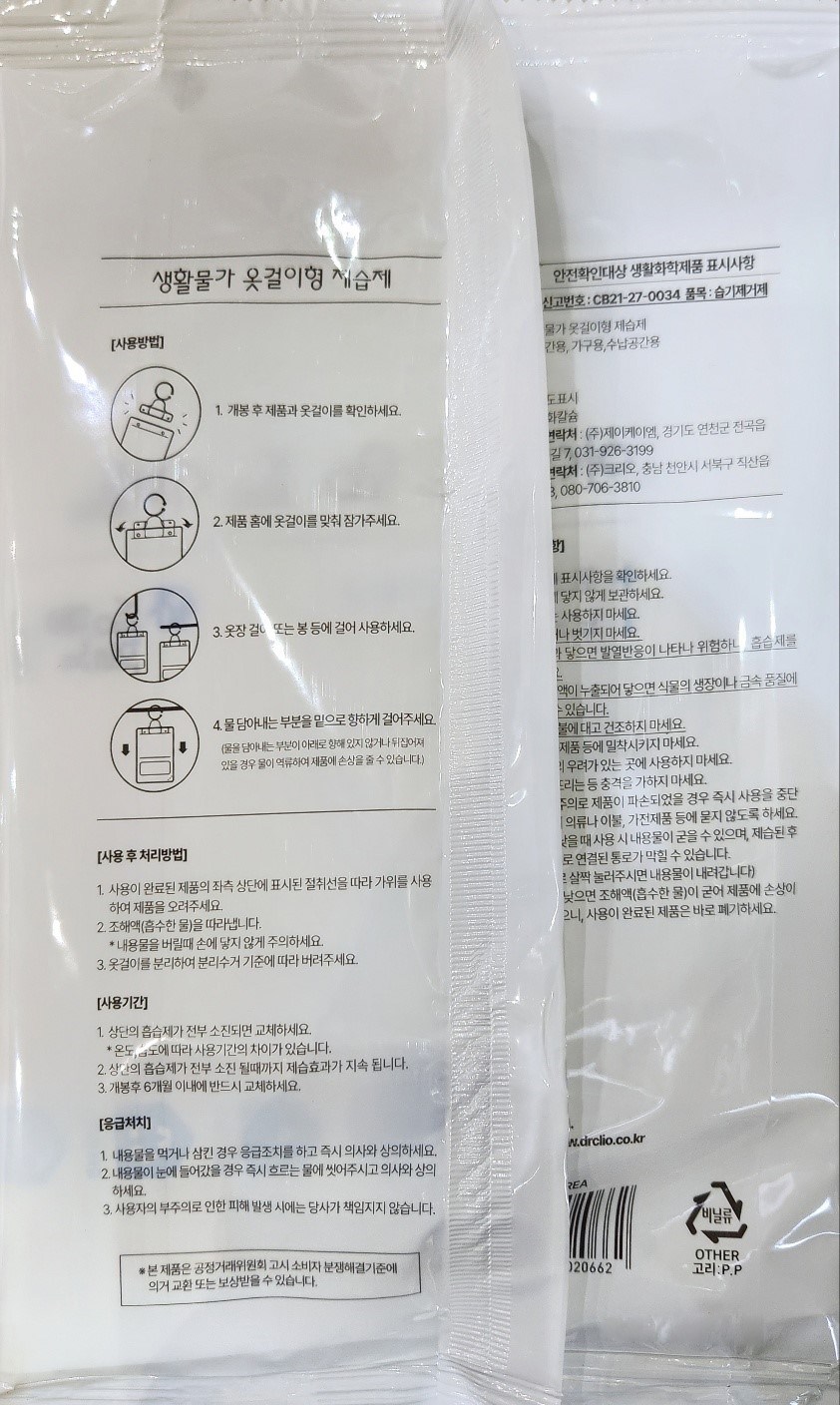| 품목 및 제품명 | 습기제거제 / 생활물가 옷걸이형 제습제 | 용도(표백제의 경우 계열을 함께표시) 및 제형 | 가구용,실내공간용,수납공간용 / 비분사형-고체형 |