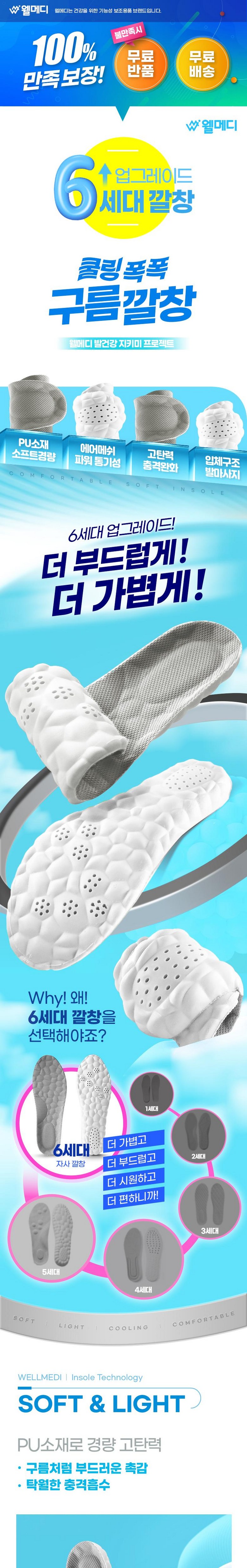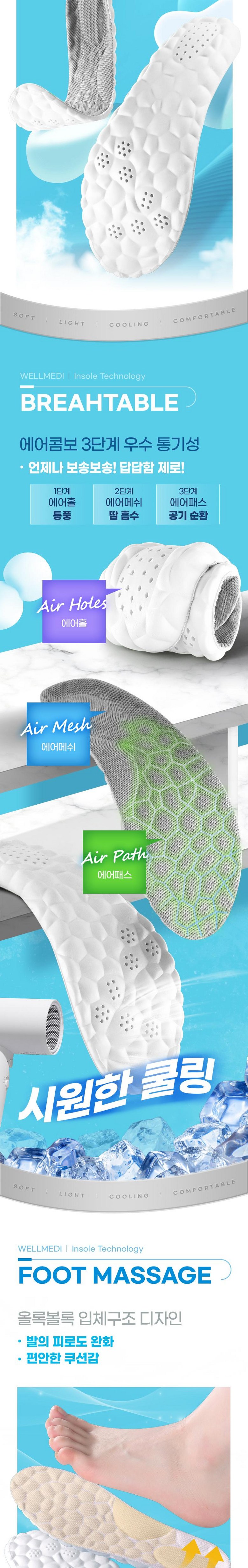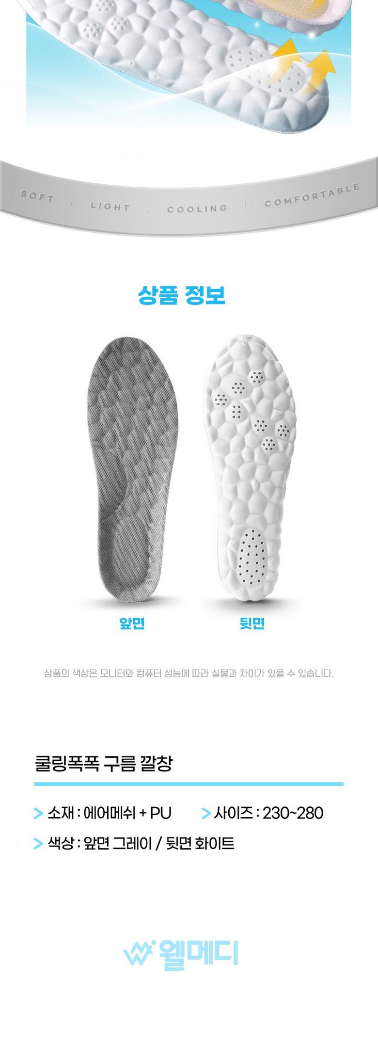 | 종류 | 웰메디 6세대 에어메쉬 쿨링 폭폭 구름 깔창 | 소재 | 에어메쉬+PU |