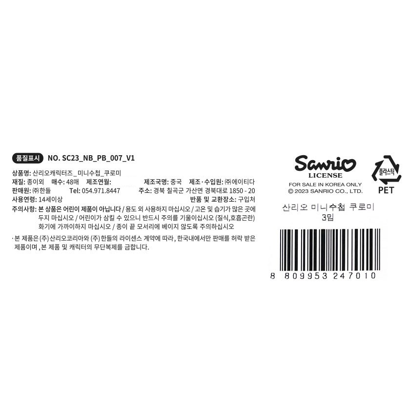 | 품명 및 모델명 | 산리오 미니수첩 쿠로미 3입 | 인증/허가 사항 | 해당없음 |
