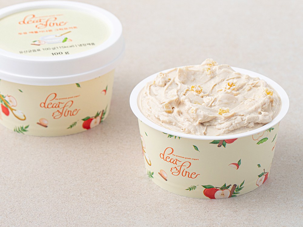 그릭요거트 전문점, 디어파인의 두유 애플시나몬 그릭요거트를 소개할게요. 원액두유를 사용해, 우유 때문에 그릭요거트를 즐기지 못하셨던 분들도 편하게 드실 수 있는데요. 꾸덕한 질감은 물론, 향긋하면서도 달달한 풍미까지 한입에 즐겨보세요. 그대로 떠서 드셔도 좋고요. 빵에 발라 먹는 스프레드로 활용해도 잘 어울려요.