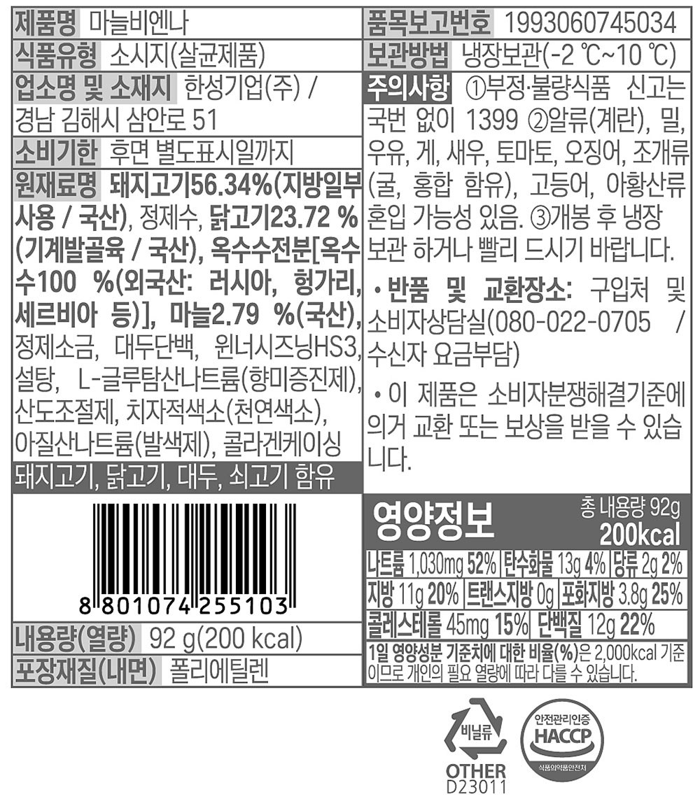 톡톡 터지는 식감이 매력적인 비엔나 소시지예요. 통통한 소시지를 한입 베어 물면, 고소하고 짭조름한 맛이 입안을 가득 채우지요. 여기에 마늘의 향긋한 풍미가 감칠맛을 더해줄 거예요. 노릇노릇하게 구워 그대로 드셔도 맛있고, 채소와 함께 볶아 풍성하게 즐기셔도 좋답니다.