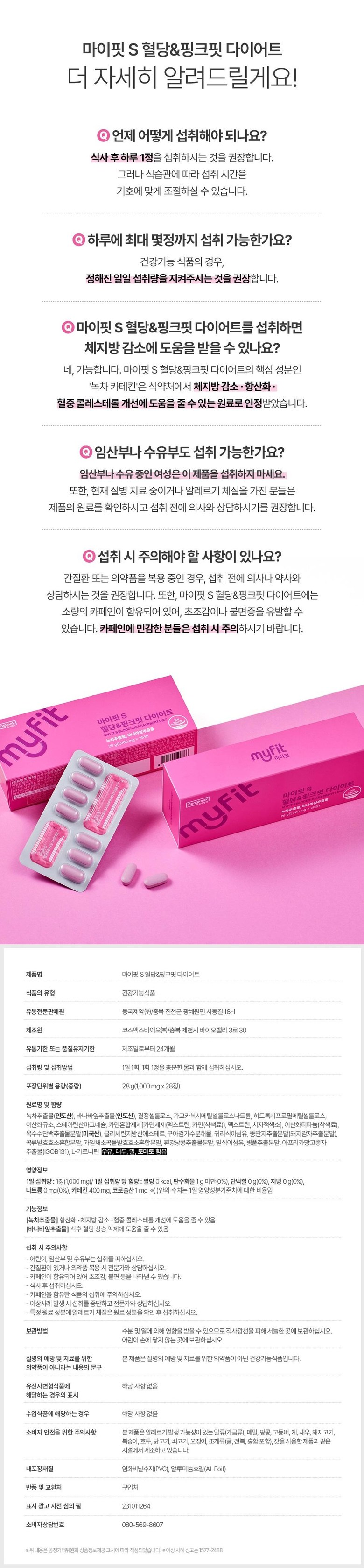 | 제품명 | 마이핏S 혈당&핑크핏 다이어트 | 제조업소의 명칭과 소재지 | 유통전문판매원 : 동국제약(주)/ 충북 진천군 광혜원면 사동길 18-1제조원 : ㅋ스맥스바이오(주) / 충북 제천시 바이오벨리 3로 30 |